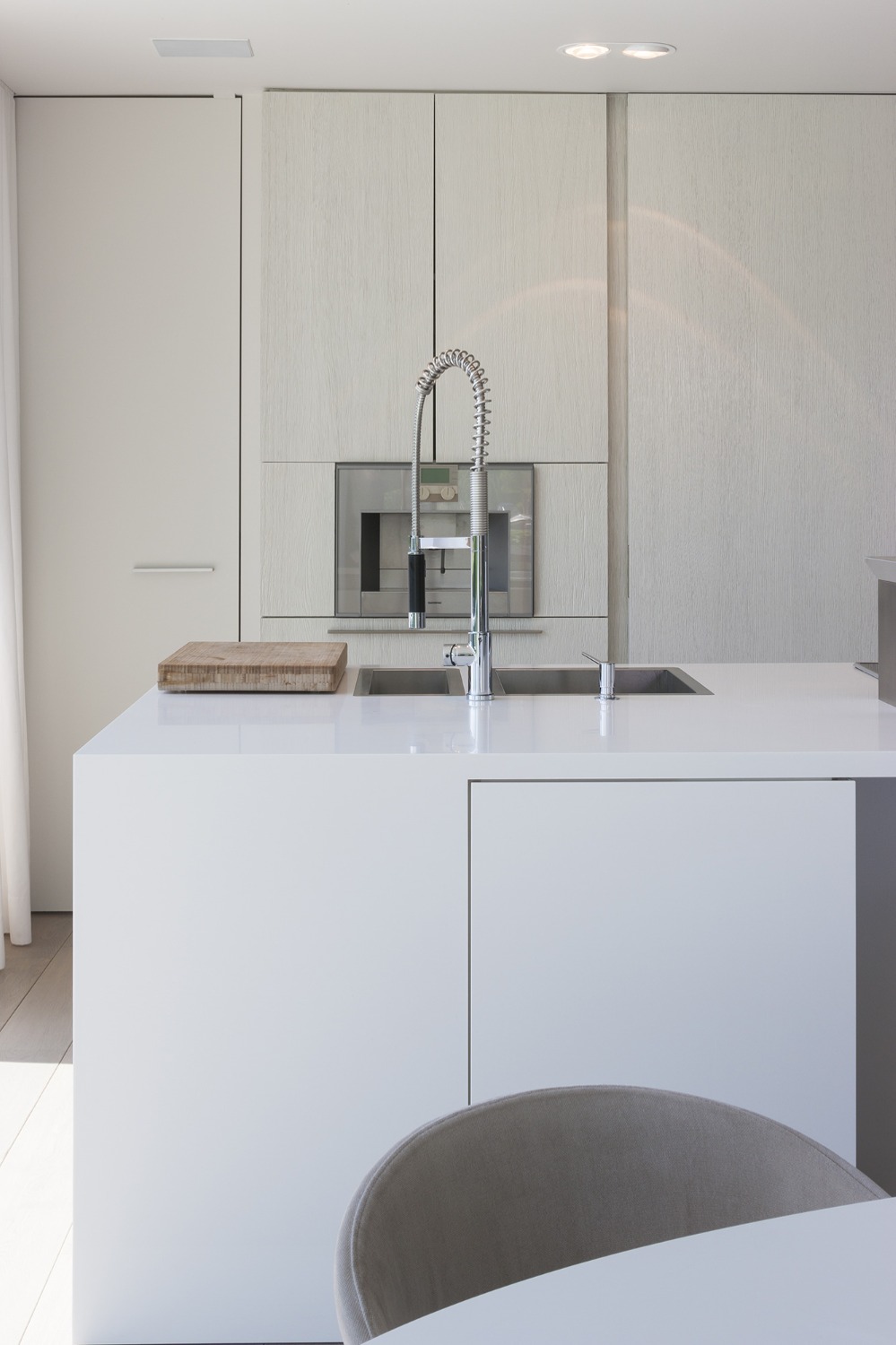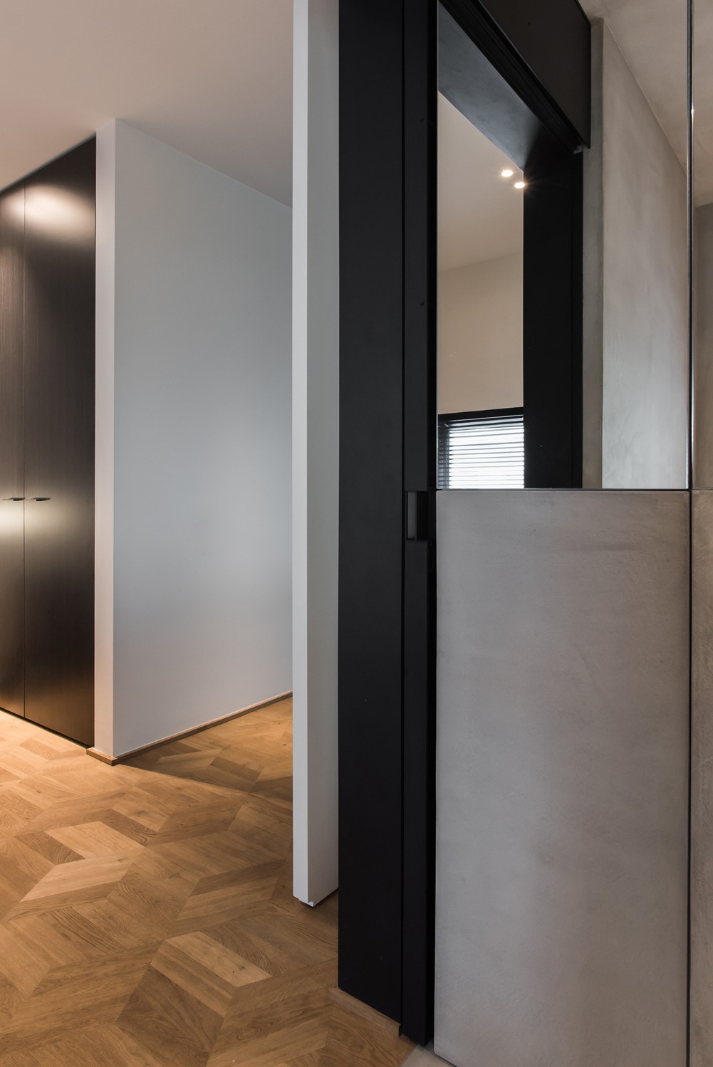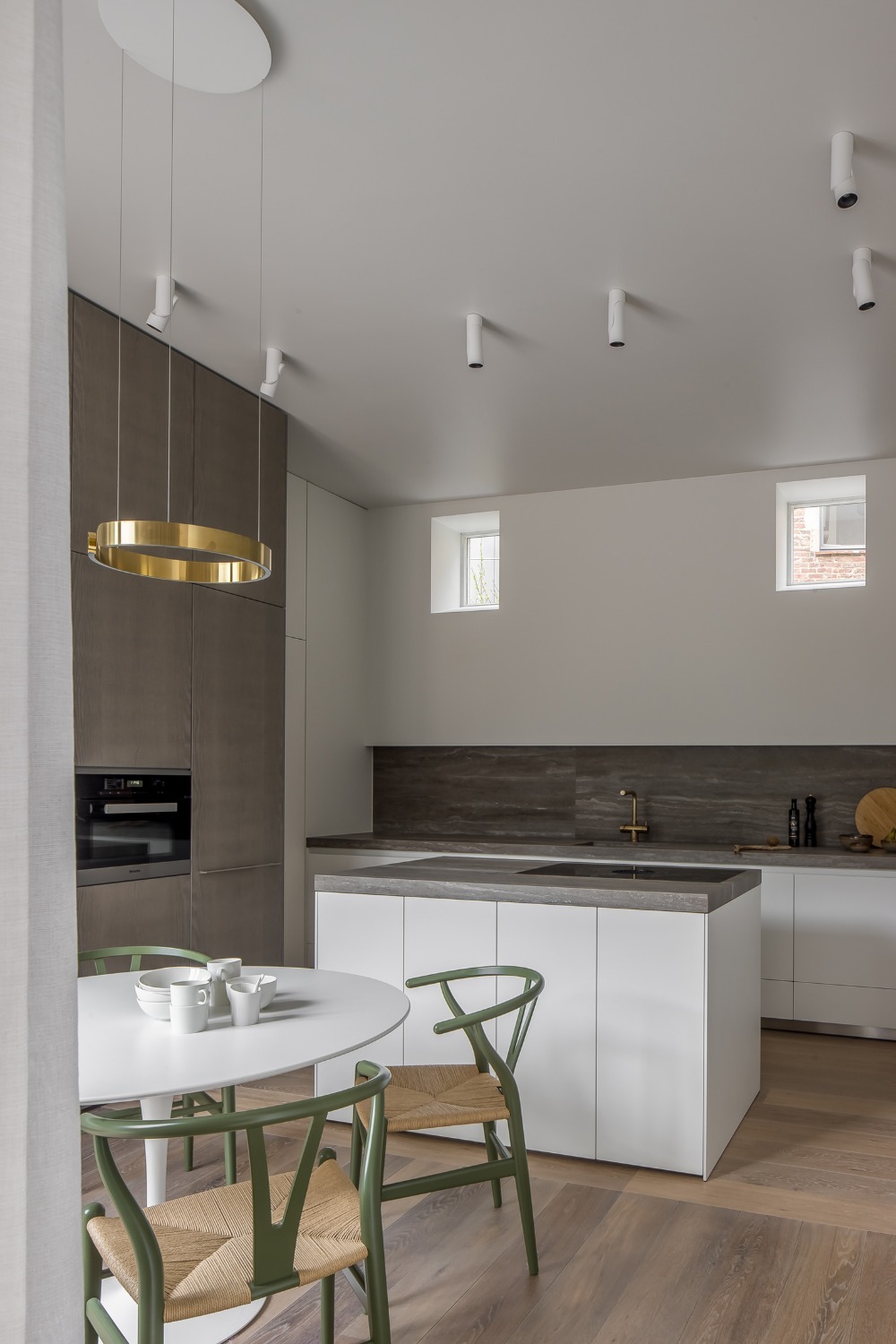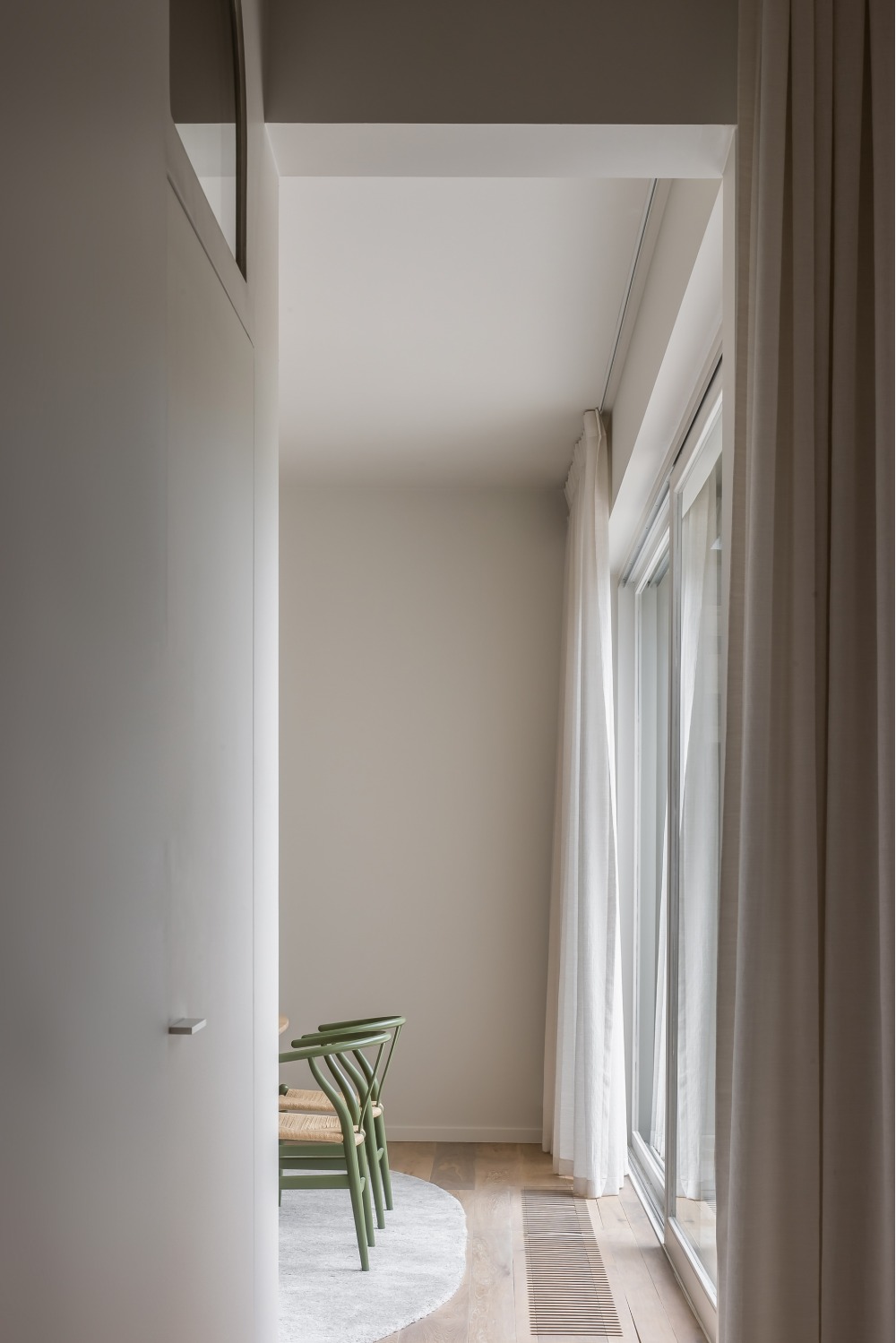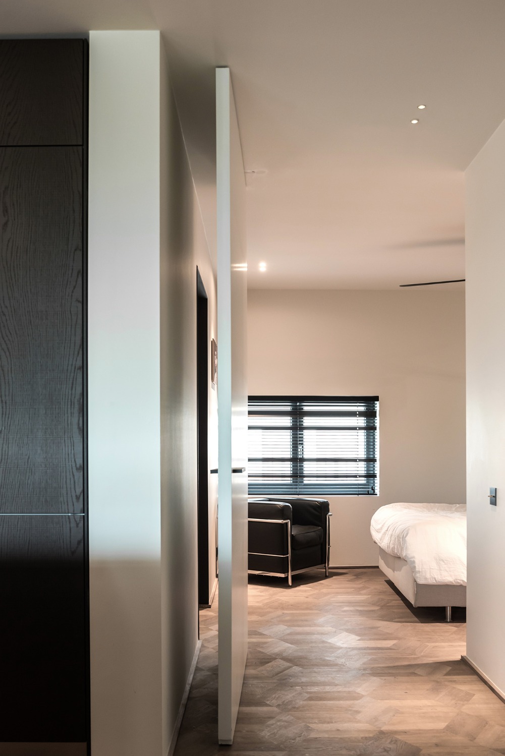 De indeling van dit nieuwbouwappartement werd volledig herbekeken. Alle overbodige circulatieruimte werd verwijderd en ingelijfd als extra leefruimte. Bergingen en technische ruimtes werden tot het absolute minimum herleid. Op deze wijze ontstond een ruime leefruimte met open keuken waar maximaal kan worden genoten van het uitzicht op de Leie en Bijlokesite. Aan de straatzijde een master slaapkamer met badkamer en een bureauruimte / logeerkamer. Warme, eigenzinnige materialen geven het appartement een zeer persoonlijke uitstraling.