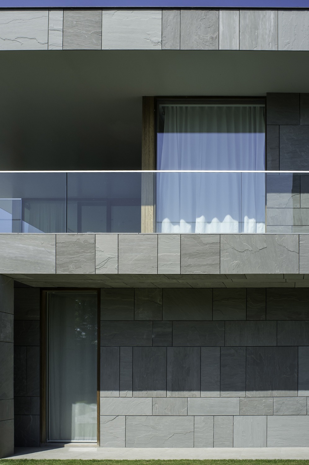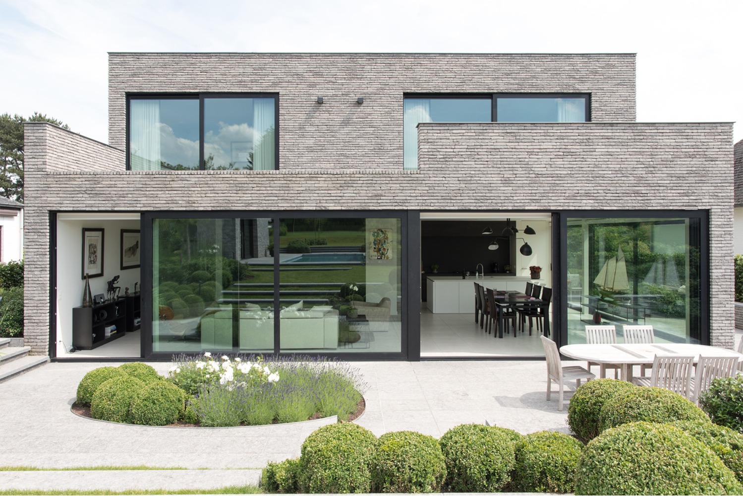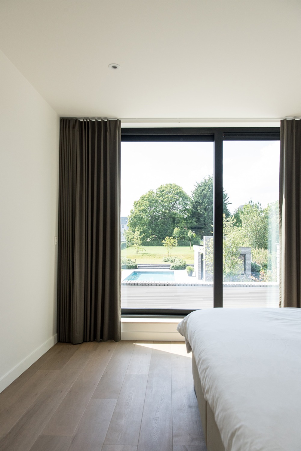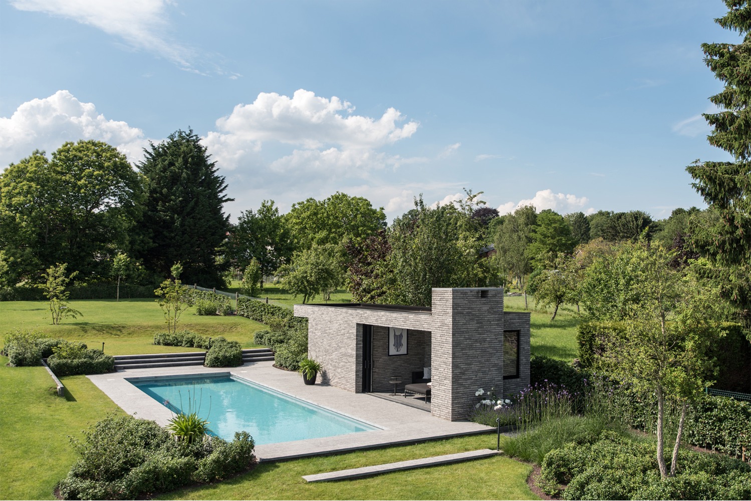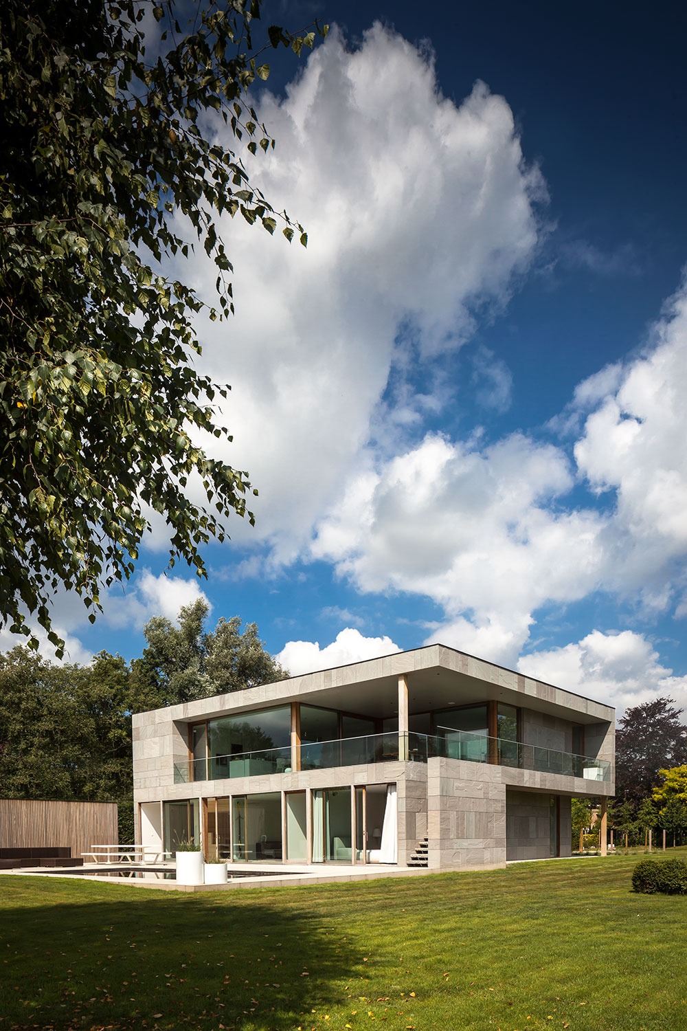 Bij het ontwerp van deze woning diende rekening gehouden te worden met het oplopende terrein. De woning werd deels in de helling ingegraven waardoor achteraan direct aansluitend op de leefruimtes een beschut terras ontstond. Brede stenen treden leiden vanaf dit terras naar het hoger gelegen zwembad en poolhouse. De voorzijde van de woning werd bewust gesloten gehouden. Enkel de bureauruimte biedt uitzicht op de straatzijde. Door middel van een patio werd op de verdieping een intieme buitenruimte gecreëerd die de badkamer, fitness- en welnessruimte van daglicht voorziet. De slaapkamers kijken acteraan uit over de tuin. Een extra logeerkamer met badkamer werd voorzien op het gelijkvloers en geniet van een kleine eigen beschutte buitenruimte.
