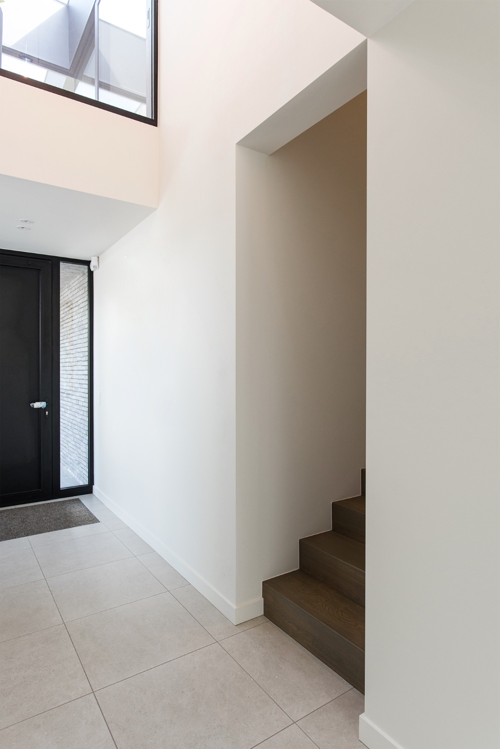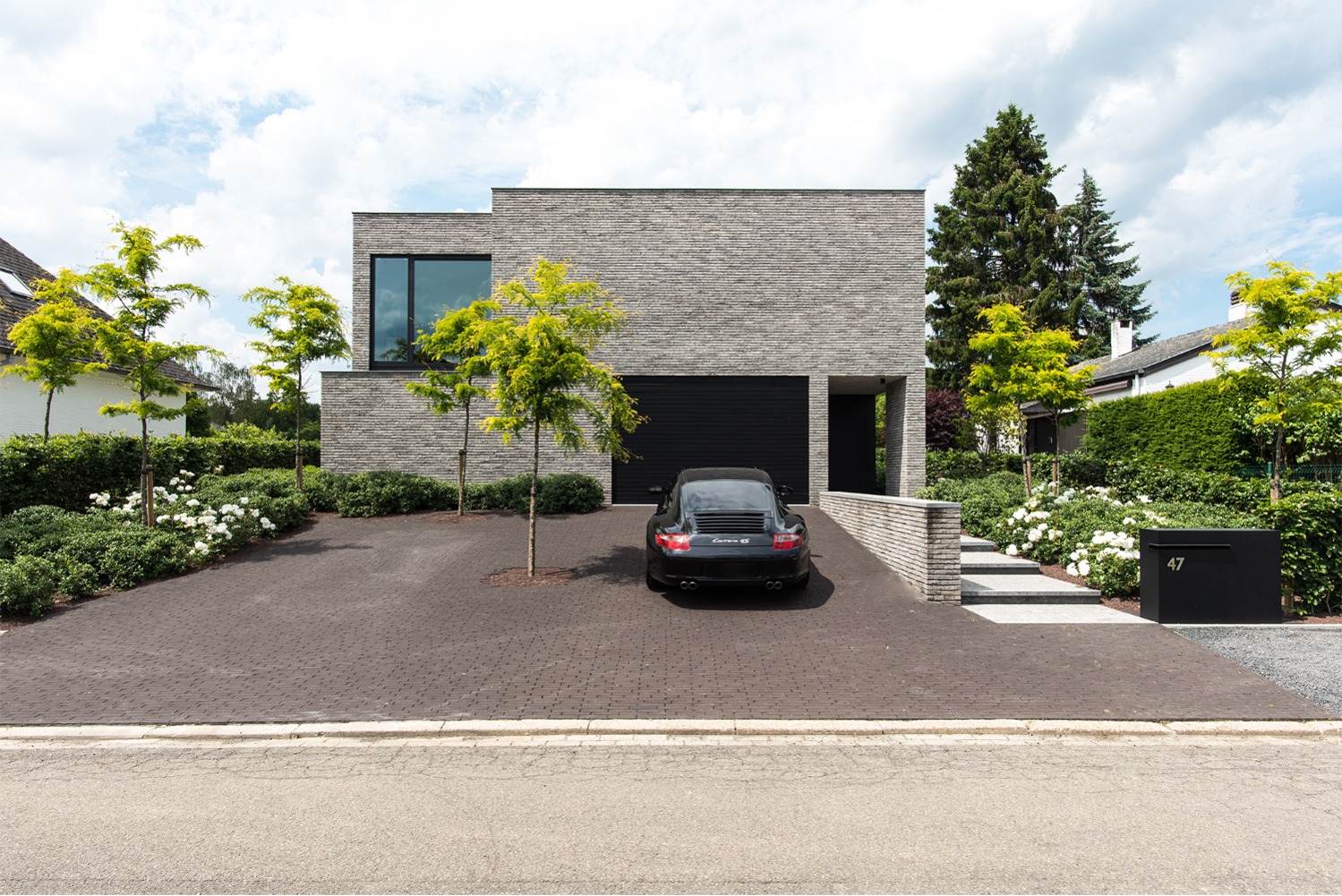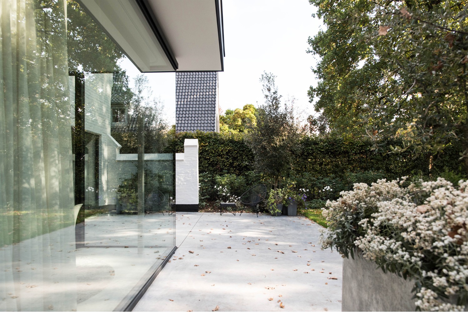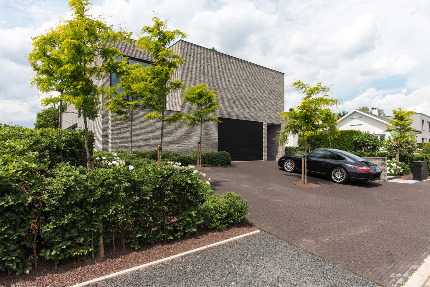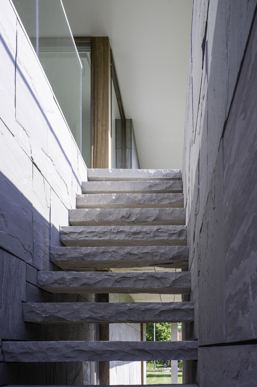 Bij het ontwerp van deze woning diende rekening gehouden te worden met het oplopende terrein. De woning werd deels in de helling ingegraven waardoor achteraan direct aansluitend op de leefruimtes een beschut terras ontstond. Brede stenen treden leiden vanaf dit terras naar het hoger gelegen zwembad en poolhouse. De voorzijde van de woning werd bewust gesloten gehouden. Enkel de bureauruimte biedt uitzicht op de straatzijde. Door middel van een patio werd op de verdieping een intieme buitenruimte gecreëerd die de badkamer, fitness- en welnessruimte van daglicht voorziet. De slaapkamers kijken acteraan uit over de tuin. Een extra logeerkamer met badkamer werd voorzien op het gelijkvloers en geniet van een kleine eigen beschutte buitenruimte.