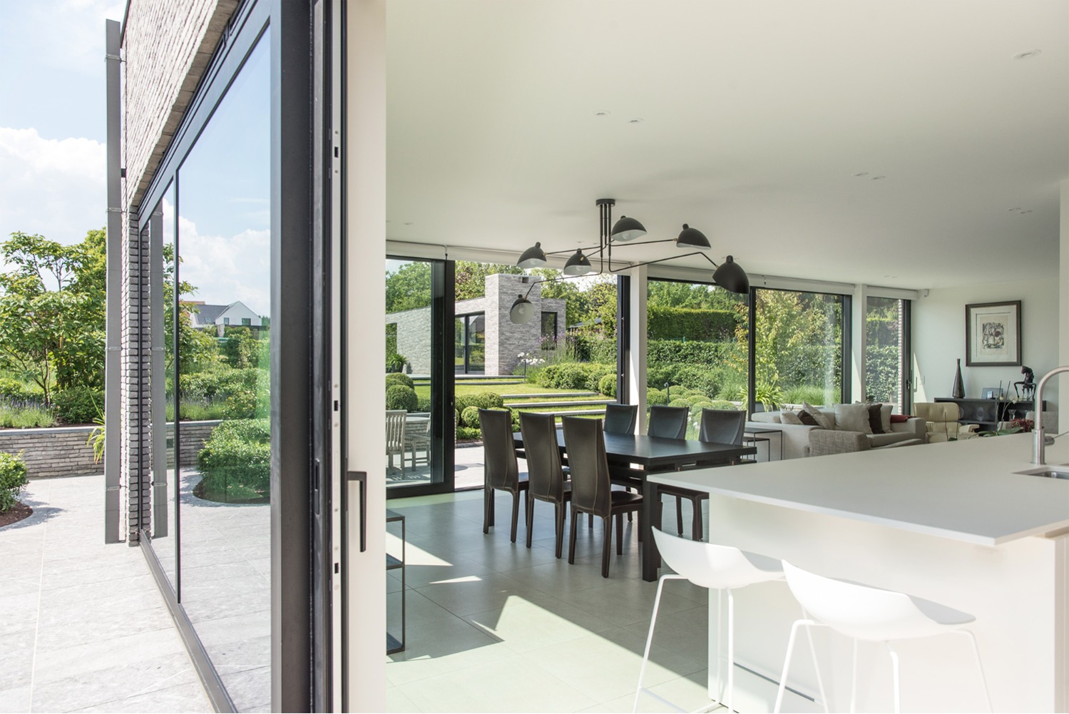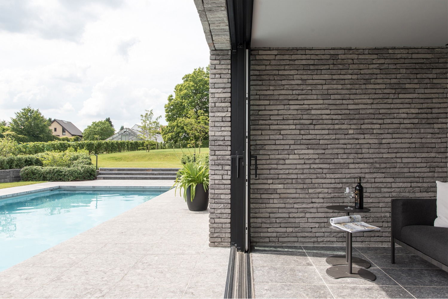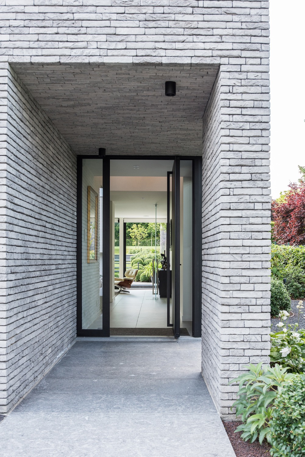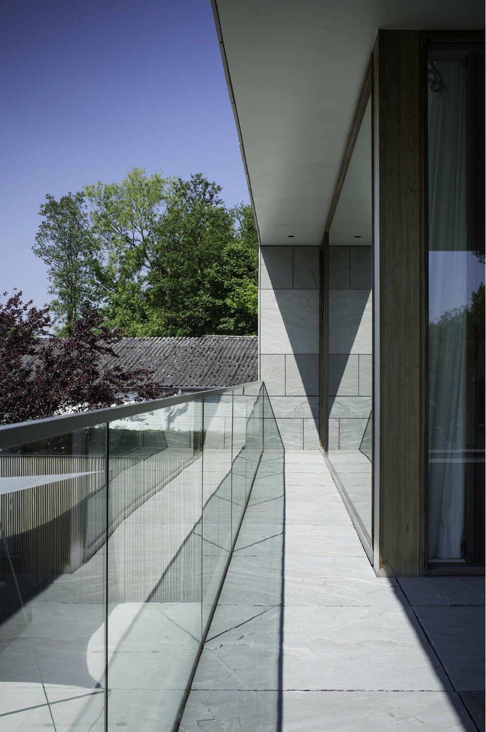 Bij het ontwerp van deze woning diende rekening gehouden te worden met het oplopende terrein. De woning werd deels in de helling ingegraven waardoor achteraan direct aansluitend op de leefruimtes een beschut terras ontstond. Brede stenen treden leiden vanaf dit terras naar het hoger gelegen zwembad en poolhouse. De voorzijde van de woning werd bewust gesloten gehouden. Enkel de bureauruimte biedt uitzicht op de straatzijde. Door middel van een patio werd op de verdieping een intieme buitenruimte gecreëerd die de badkamer, fitness- en welnessruimte van daglicht voorziet. De slaapkamers kijken acteraan uit over de tuin. Een extra logeerkamer met badkamer werd voorzien op het gelijkvloers en geniet van een kleine eigen beschutte buitenruimte.
