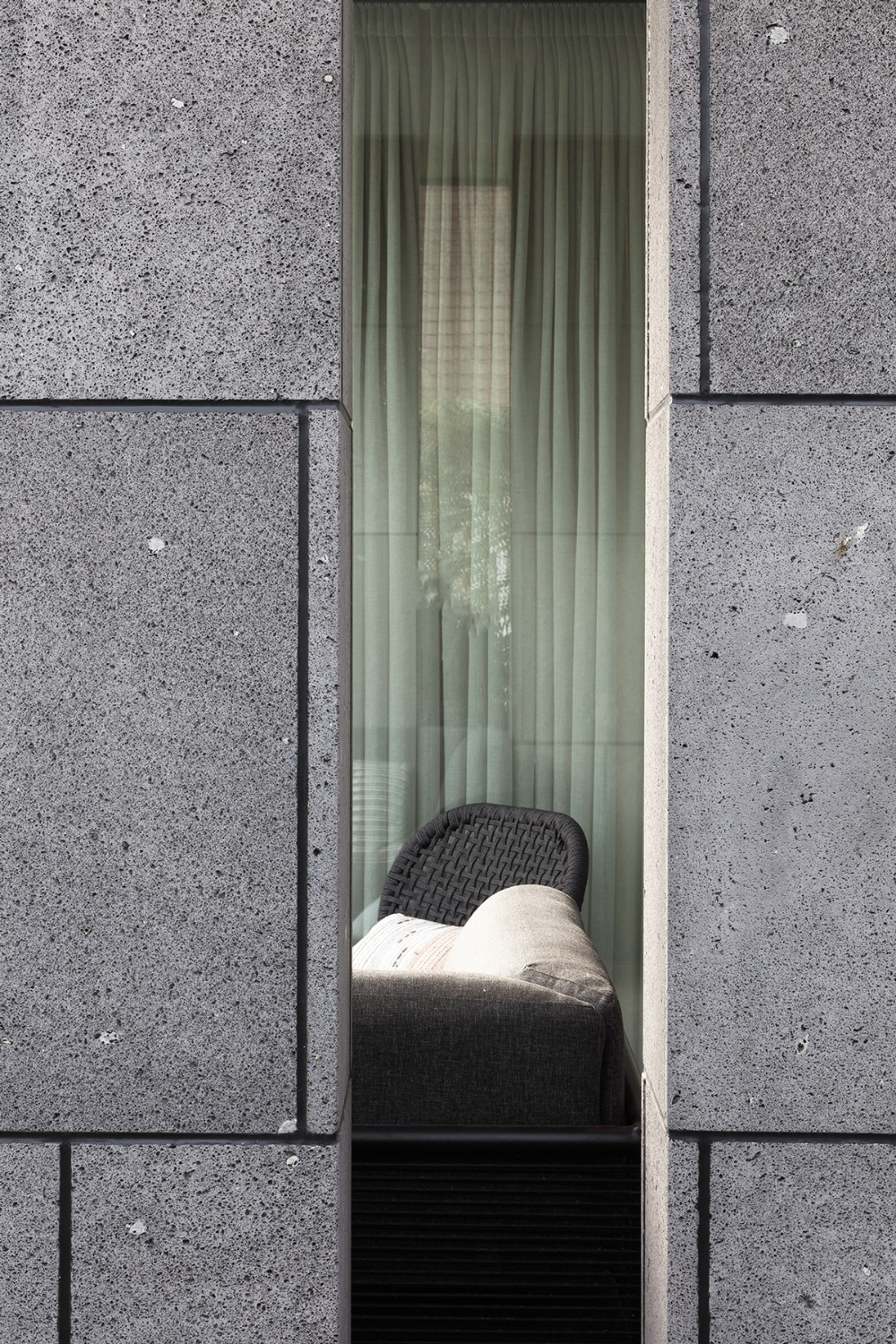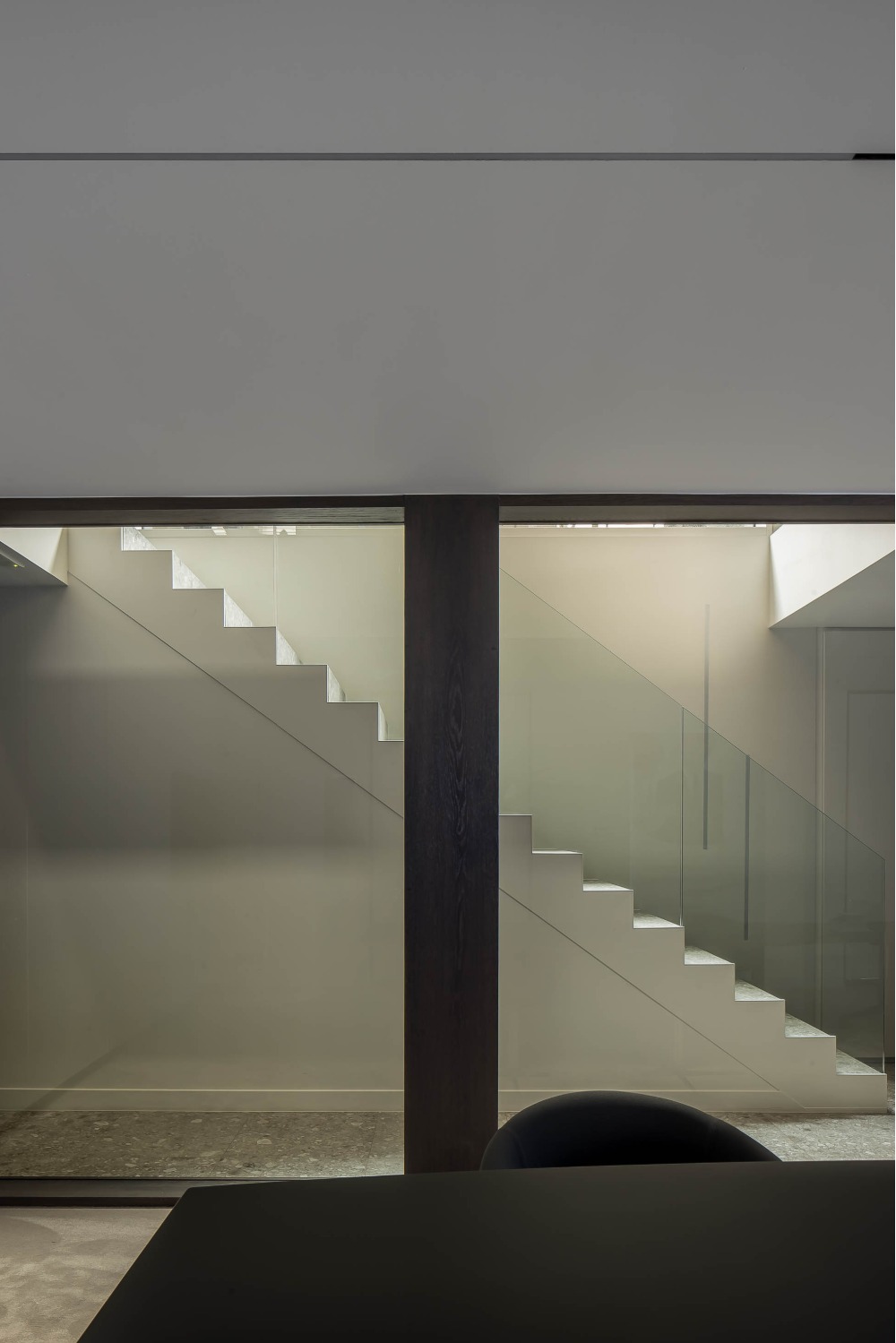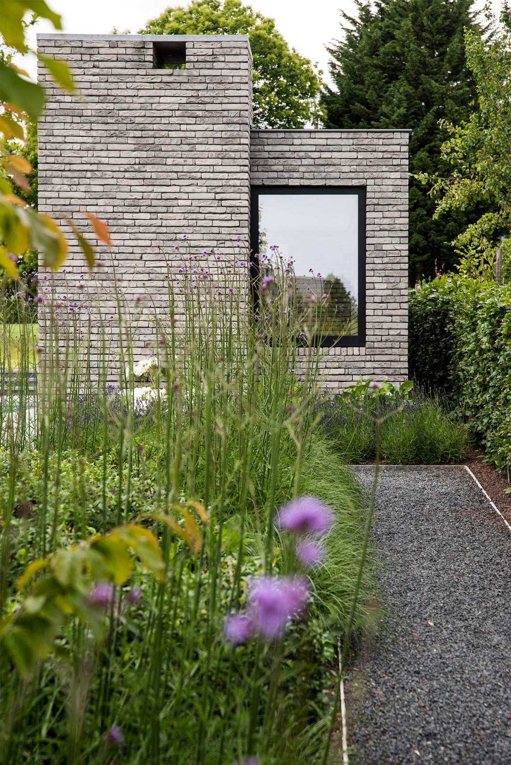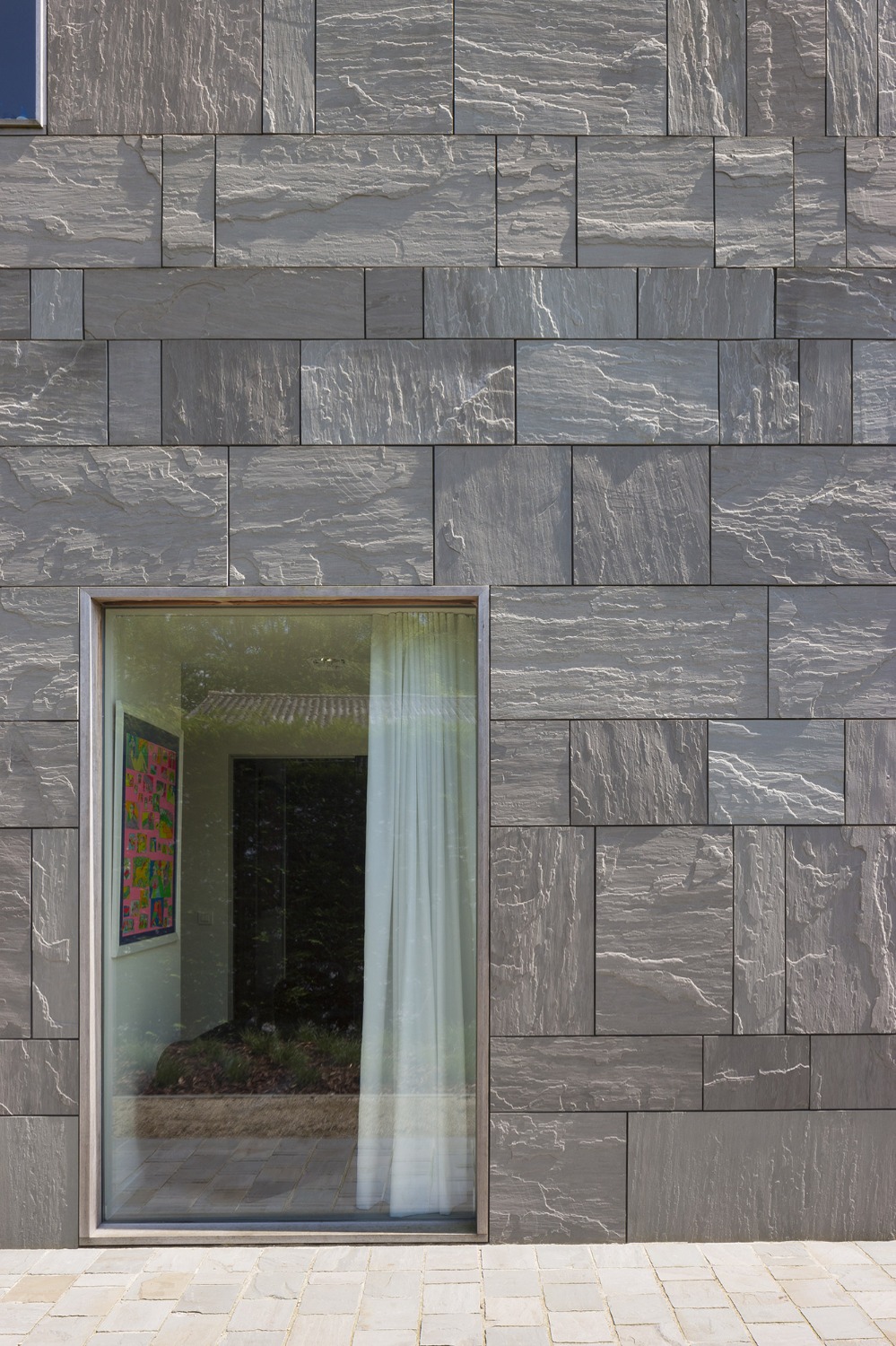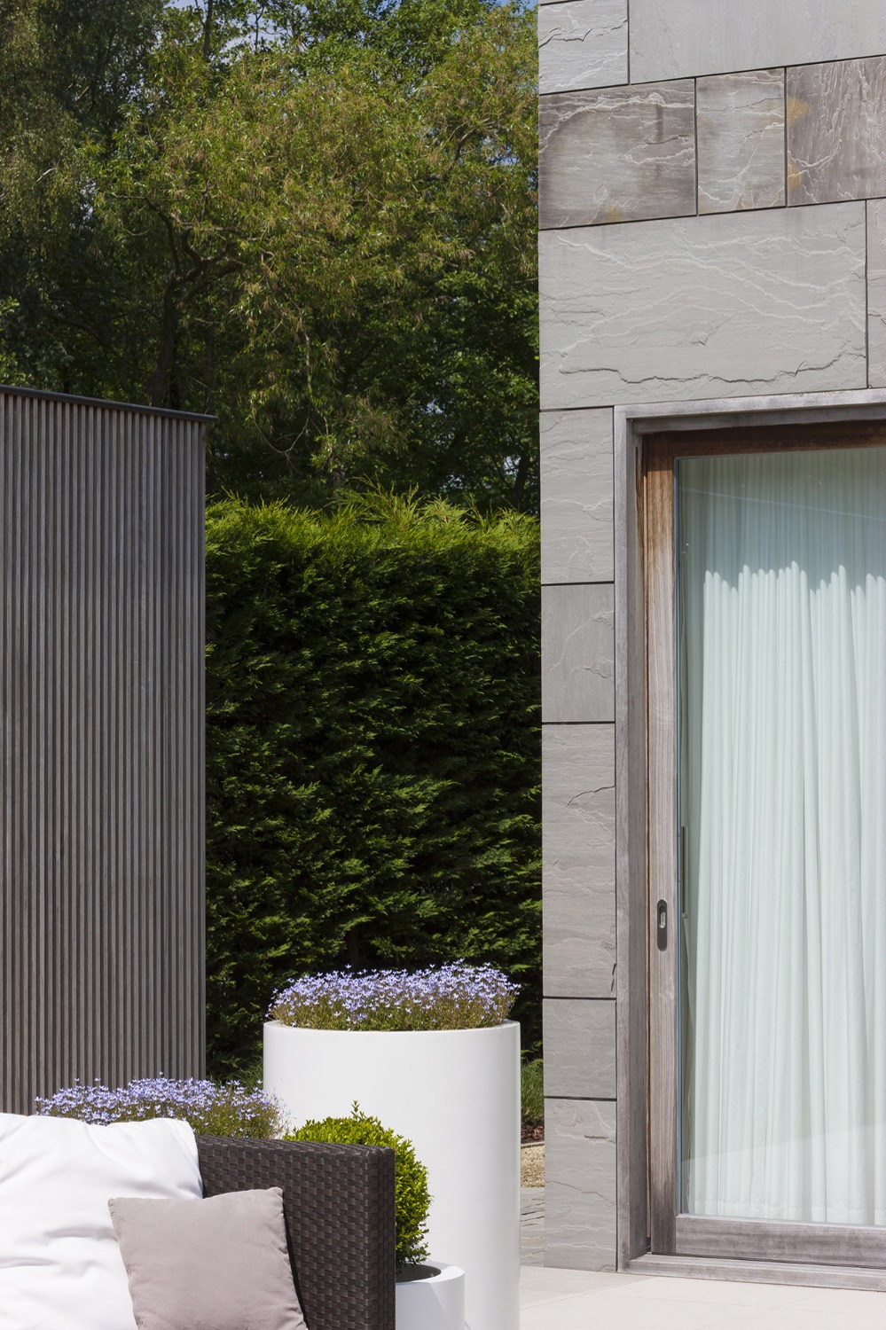 Bij het ontwerp van deze woning diende rekening gehouden te worden met het oplopende terrein. De woning werd deels in de helling ingegraven waardoor achteraan direct aansluitend op de leefruimtes een beschut terras ontstond. Brede stenen treden leiden vanaf dit terras naar het hoger gelegen zwembad en poolhouse. De voorzijde van de woning werd bewust gesloten gehouden. Enkel de bureauruimte biedt uitzicht op de straatzijde. Door middel van een patio werd op de verdieping een intieme buitenruimte gecreëerd die de badkamer, fitness- en welnessruimte van daglicht voorziet. De slaapkamers kijken acteraan uit over de tuin. Een extra logeerkamer met badkamer werd voorzien op het gelijkvloers en geniet van een kleine eigen beschutte buitenruimte.
