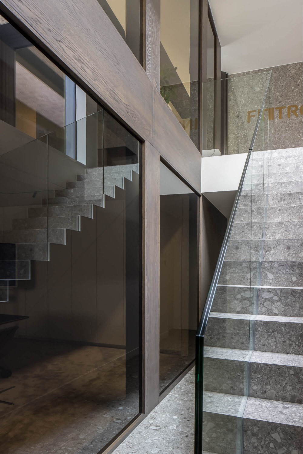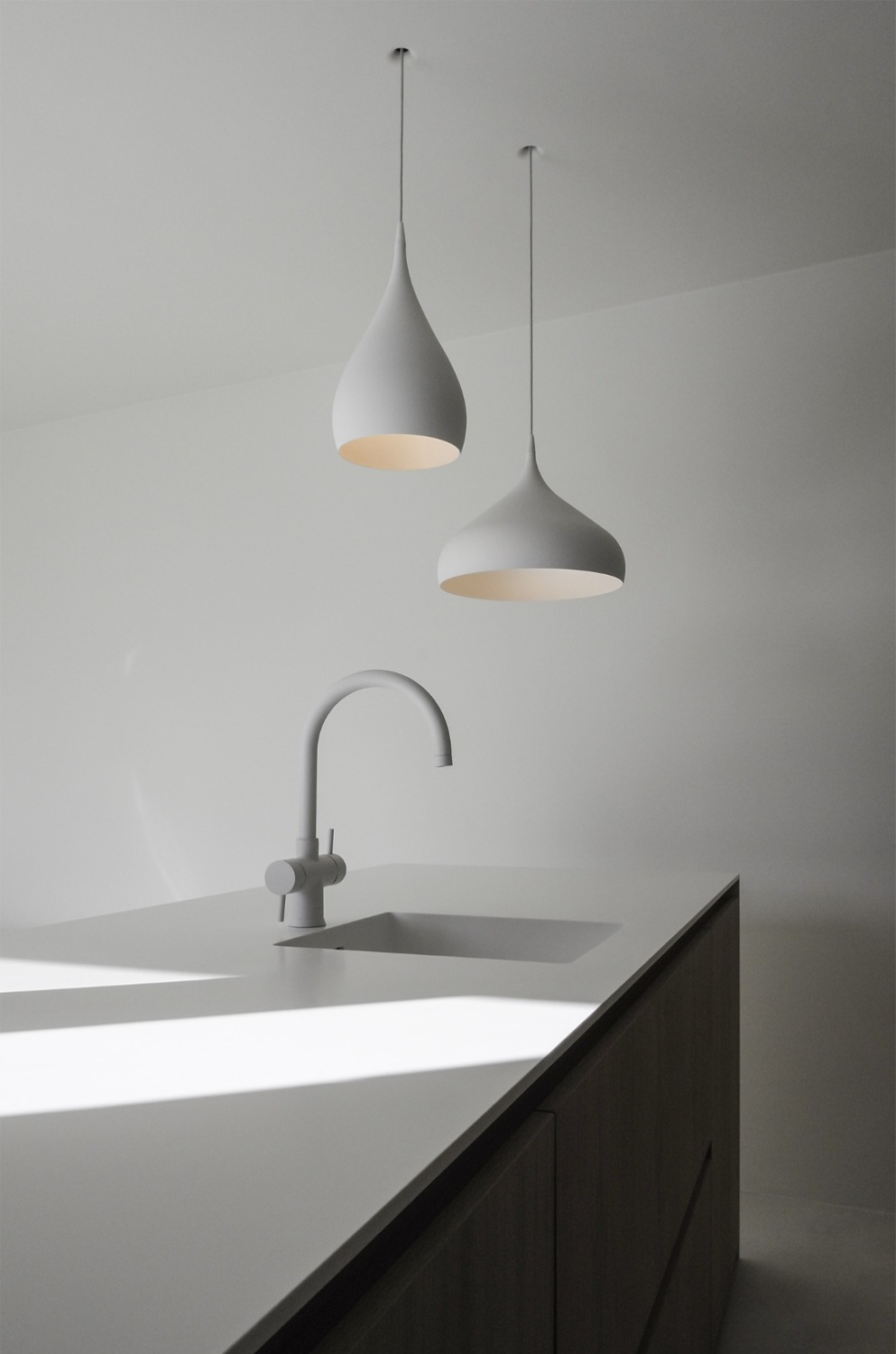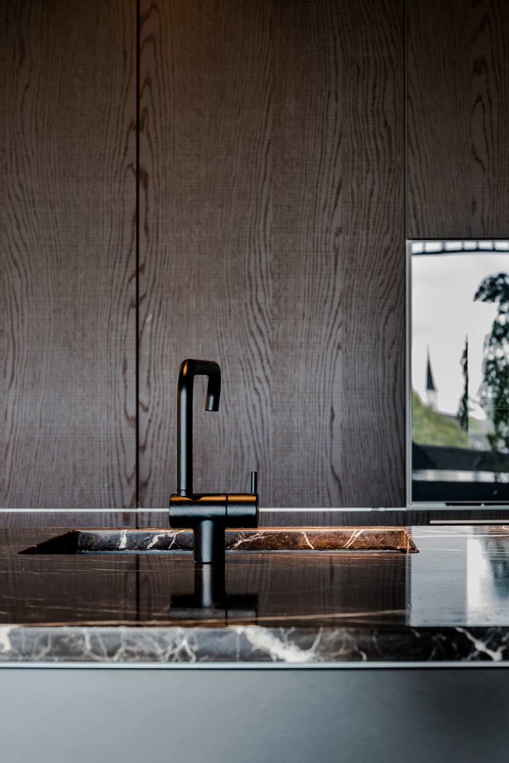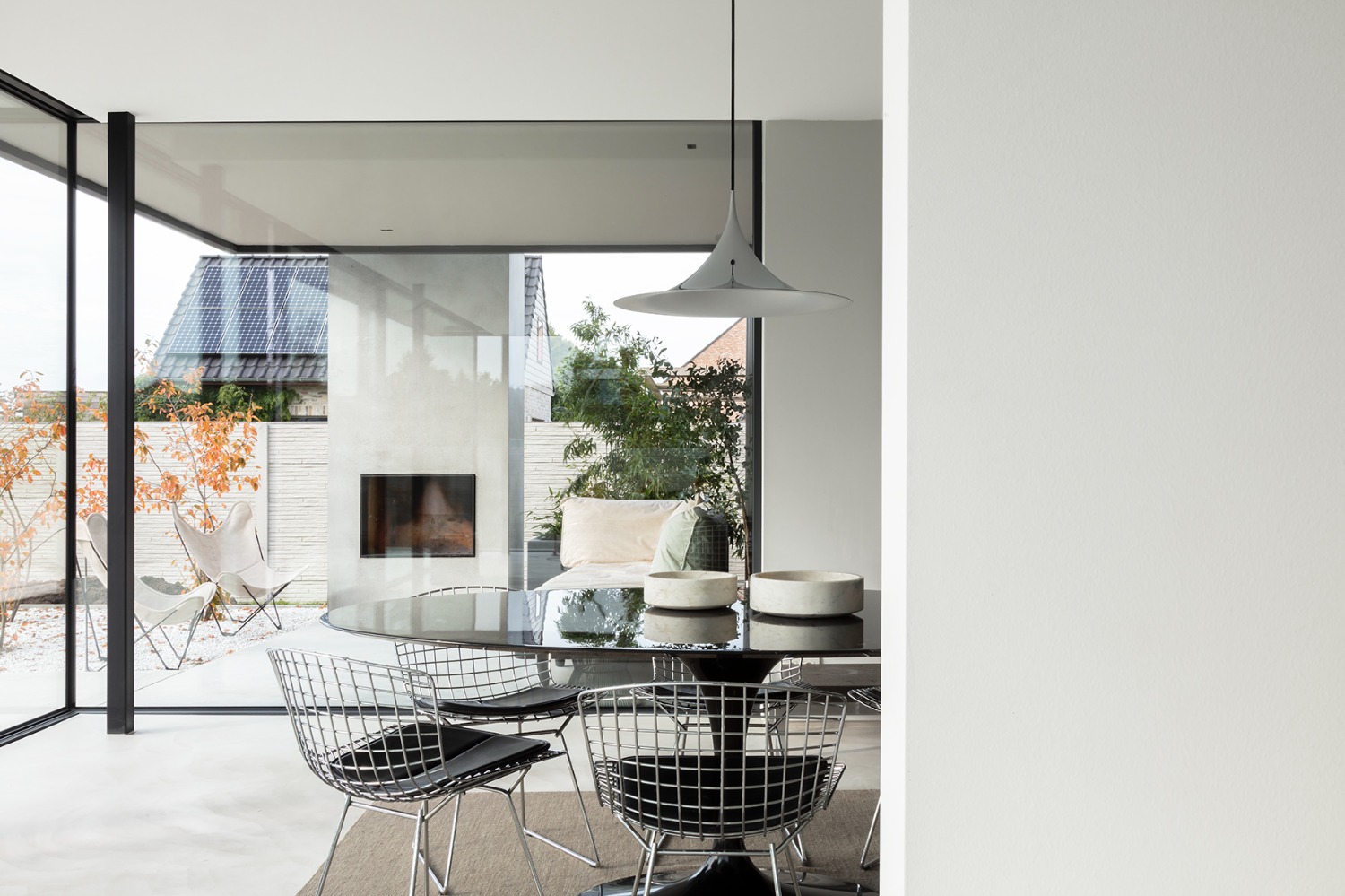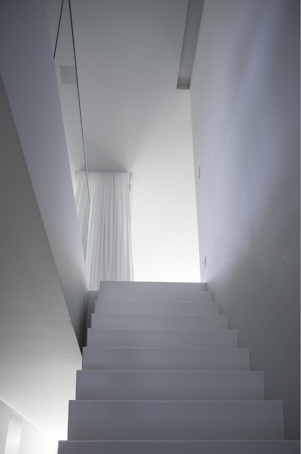 Bij het ontwerp van deze woning diende rekening gehouden te worden met het oplopende terrein. De woning werd deels in de helling ingegraven waardoor achteraan direct aansluitend op de leefruimtes een beschut terras ontstond. Brede stenen treden leiden vanaf dit terras naar het hoger gelegen zwembad en poolhouse. De voorzijde van de woning werd bewust gesloten gehouden. Enkel de bureauruimte biedt uitzicht op de straatzijde. Door middel van een patio werd op de verdieping een intieme buitenruimte gecreëerd die de badkamer, fitness- en welnessruimte van daglicht voorziet. De slaapkamers kijken acteraan uit over de tuin. Een extra logeerkamer met badkamer werd voorzien op het gelijkvloers en geniet van een kleine eigen beschutte buitenruimte.