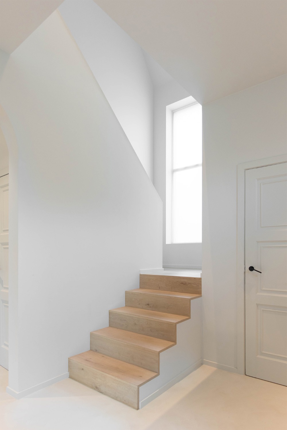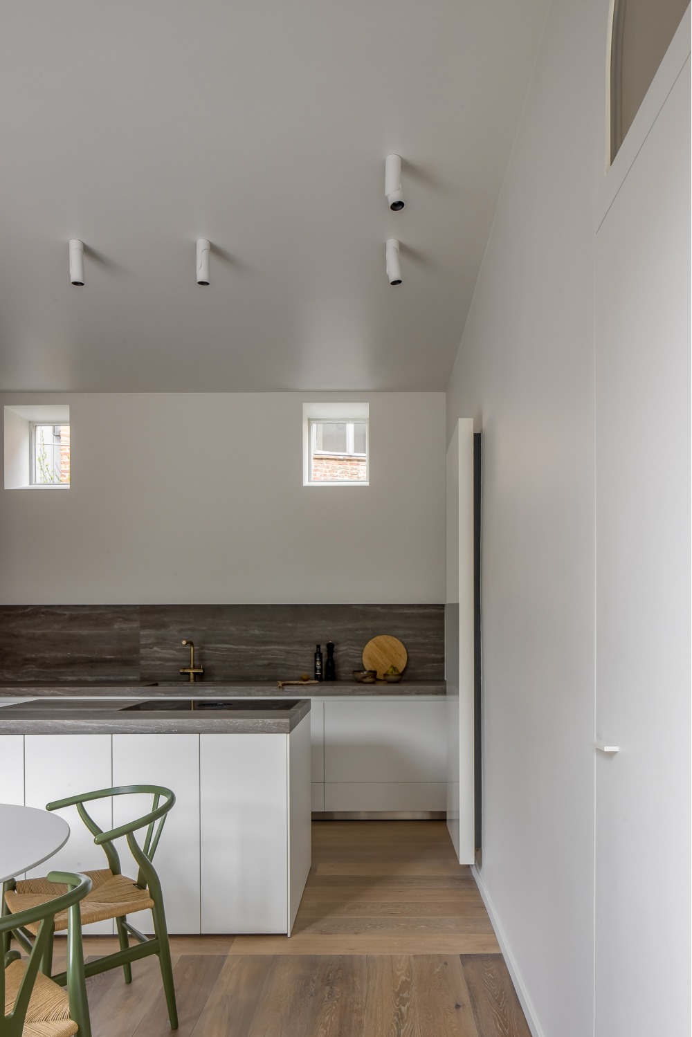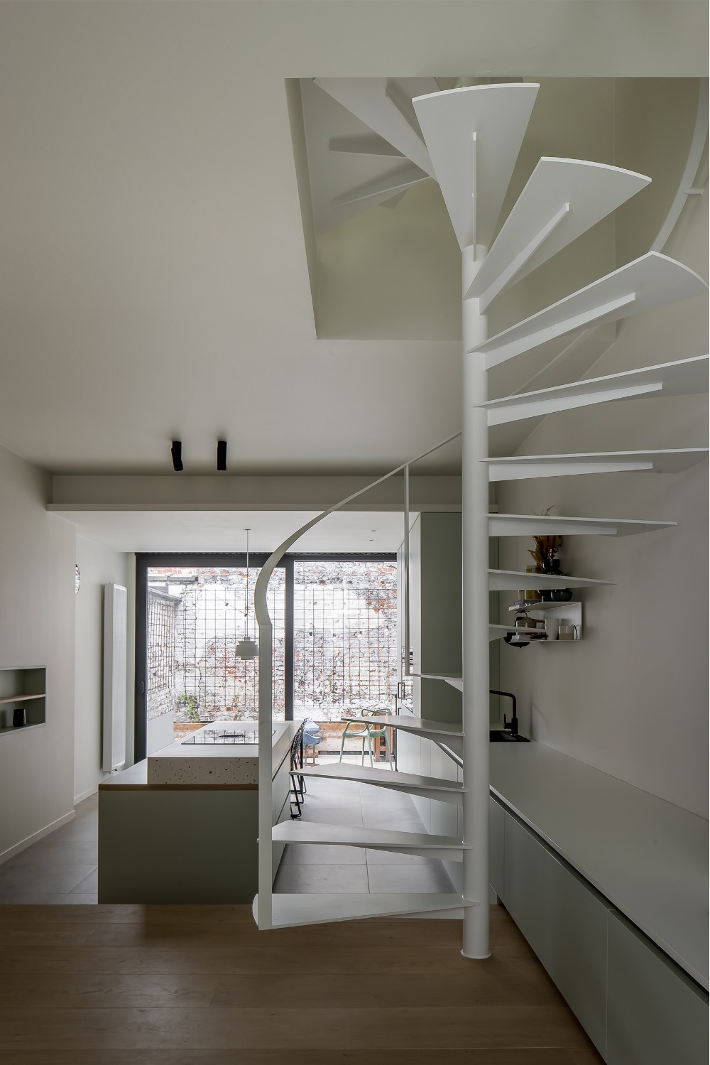 De opdracht betrof de verbouwing van een arbeiderswoning in een beschermde gevelrij. De typerende indeling met voor- en achterkamer gescheiden door een dwarse, te steile trap werd volledig herbekeken. De bestaande achterbouw werd hierbij vervangen en opengewerkt. Een open leefkeuken met eetplaats sluit nu aan op een kleine buitenruimte. De zithoek werd op een plateau, enkele treden hoger dan de rest van de woning, geplaatst. Zo vormt de volledige benedenruimte visueel één open ruimte terwijl de verschillende functies toch hun eigen sfeer verkrijgen. Eveneens ontstaat door dit verhoog t.o.v. het straatniveau een drempel die de inkom van de private leefruimte afscheidt zonder de ruimte visueel te moeten opdelen. De bestaande trap werd vervangen door een compacte en luchtige stalen draaitrap die doorloopt tot op de zolder. Op de verdiepingen werd een slaapkamer met badkamer ingericht en op de zolder een hobbyruimte.