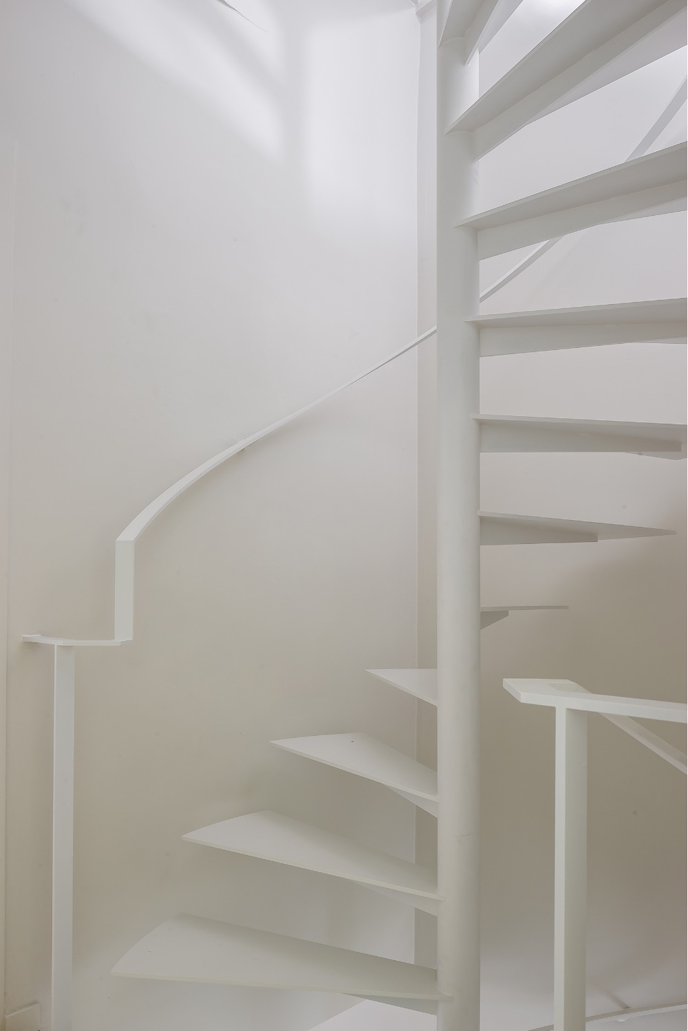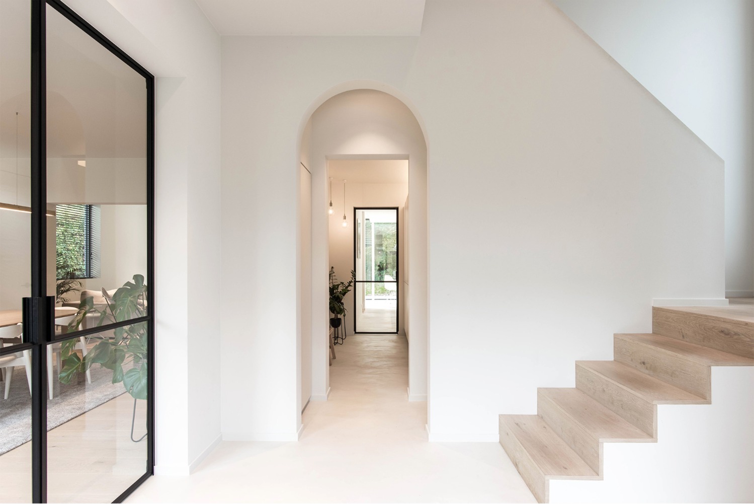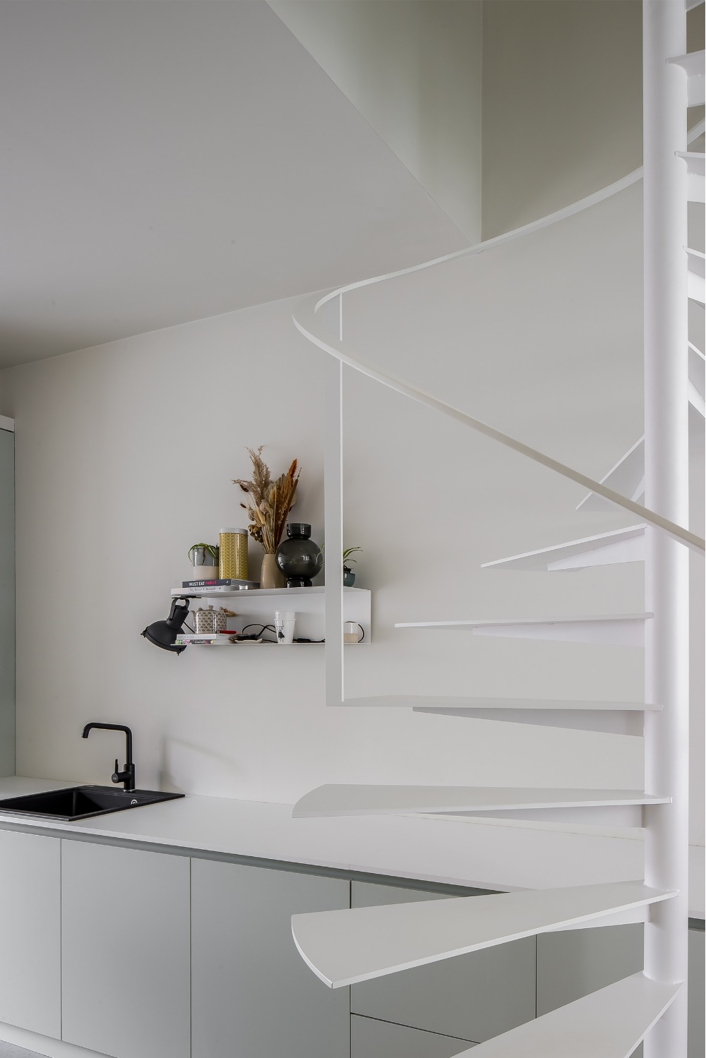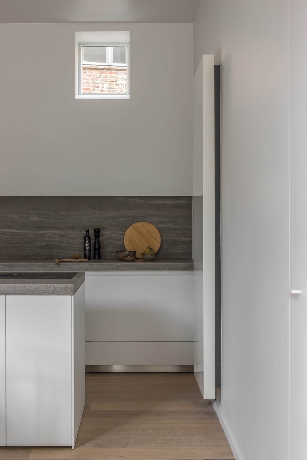 De opdracht betrof de verbouwing van een arbeiderswoning in een beschermde gevelrij. De typerende indeling met voor- en achterkamer gescheiden door een dwarse, te steile trap werd volledig herbekeken. De bestaande achterbouw werd hierbij vervangen en opengewerkt. Een open leefkeuken met eetplaats sluit nu aan op een kleine buitenruimte. De zithoek werd op een plateau, enkele treden hoger dan de rest van de woning, geplaatst. Zo vormt de volledige benedenruimte visueel één open ruimte terwijl de verschillende functies toch hun eigen sfeer verkrijgen. Eveneens ontstaat door dit verhoog t.o.v. het straatniveau een drempel die de inkom van de private leefruimte afscheidt zonder de ruimte visueel te moeten opdelen. De bestaande trap werd vervangen door een compacte en luchtige stalen draaitrap die doorloopt tot op de zolder. Op de verdiepingen werd een slaapkamer met badkamer ingericht en op de zolder een hobbyruimte.