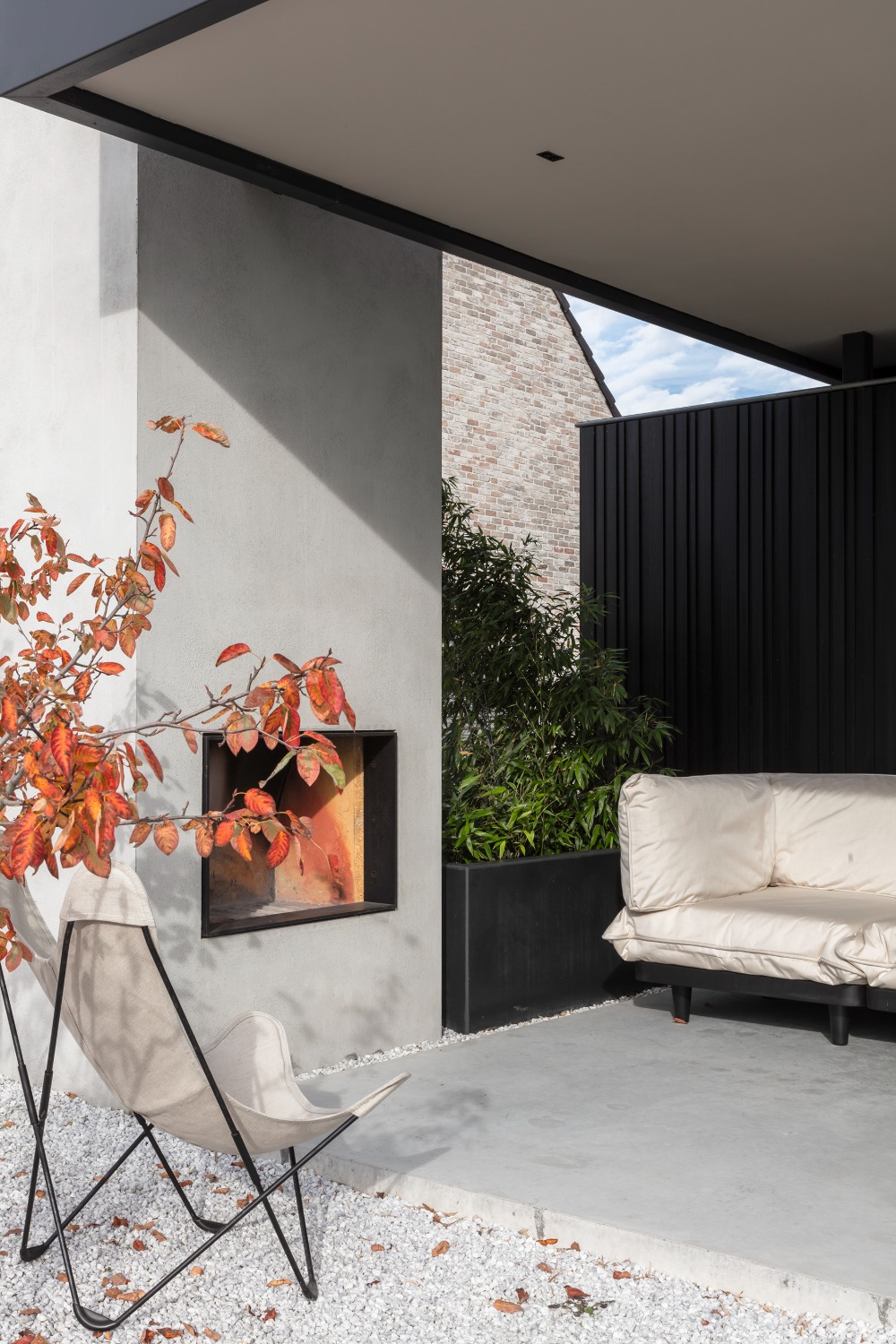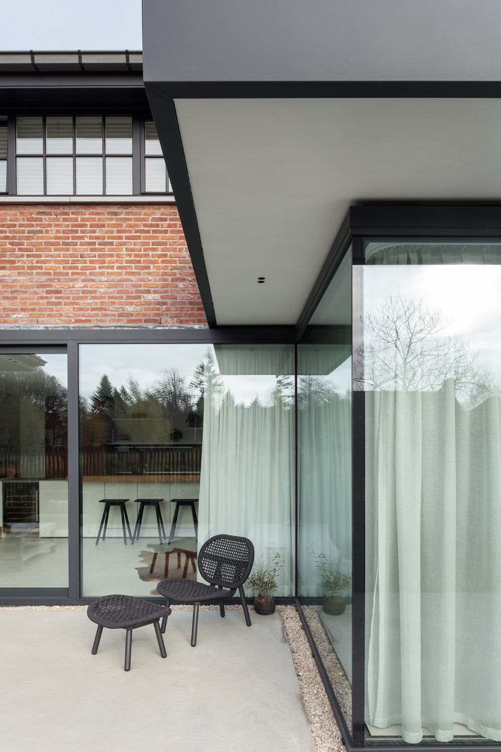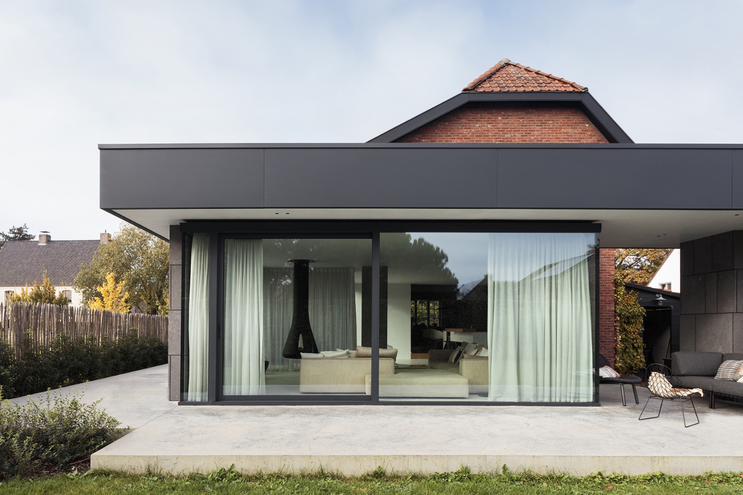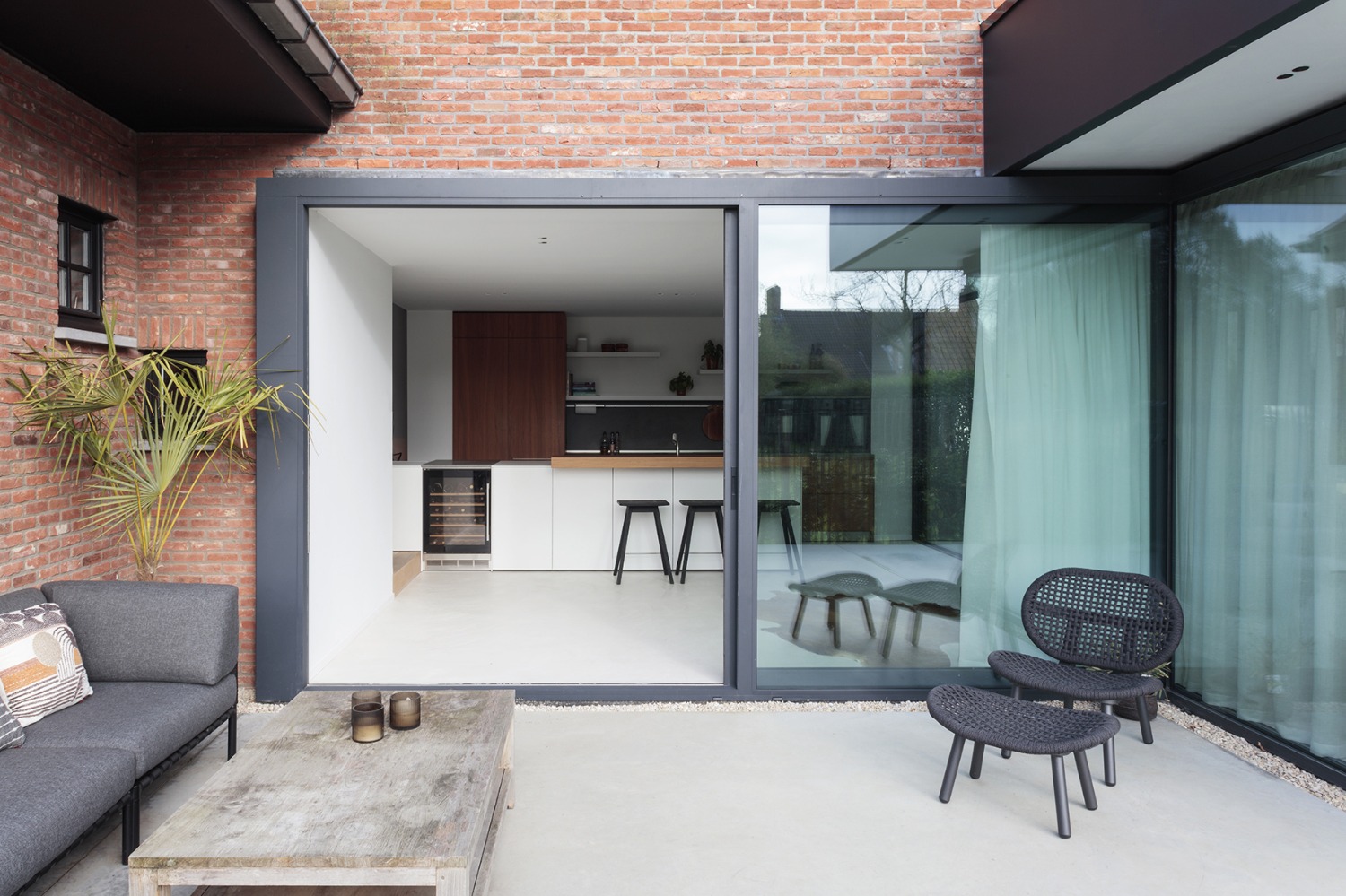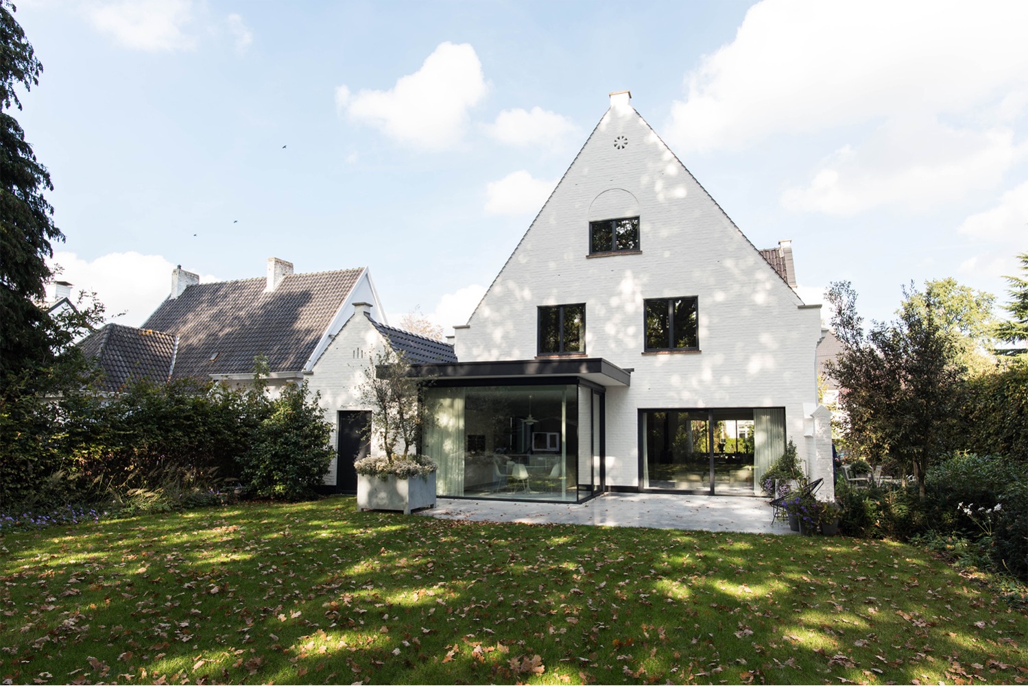 Een nieuw gelijkvloers volume vervangt de bestaande achterbouw over de volledige breedte van de achtergevel en biedt plaats aan een zithoek, eetplaats en overdekt terras met buitenhaard. Het zicht op de ruime tuin werd ten volle benut. Een nieuwe keuken, bijkeuken en master slaapkamer met dressing en badkamer werden ingericht binnen het bestaande volume.