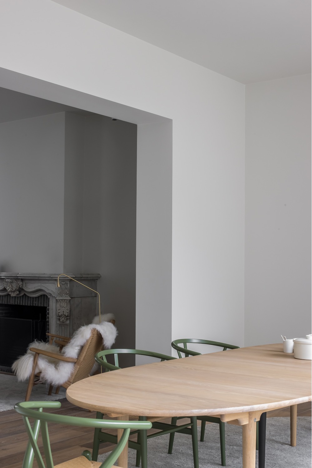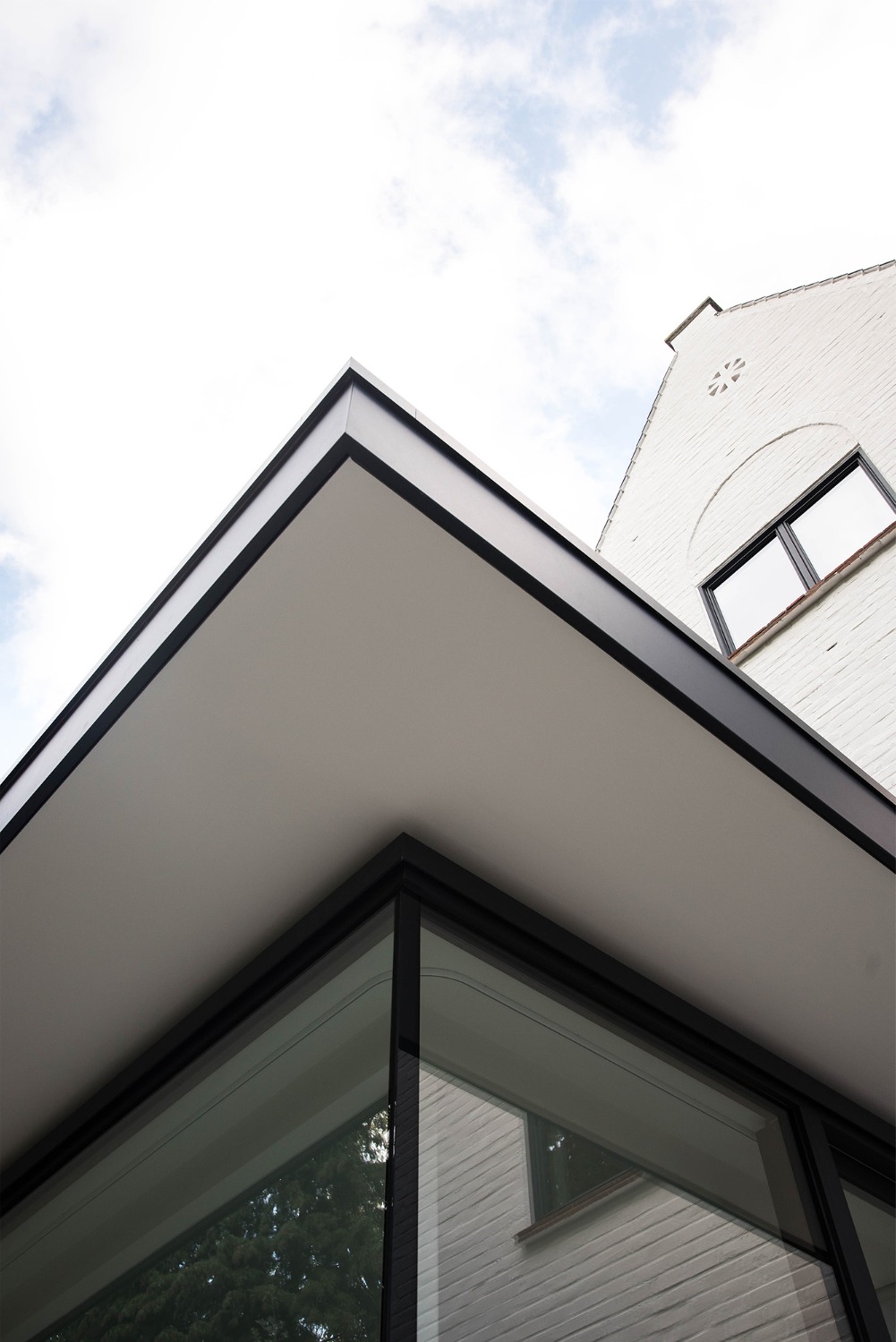 Als antwoord op dit historisch erfgoed werd resoluut gekozen voor een sterk afwijkende vormgeving, detaillering en materialisatie. Hierdoor wordt het nieuwe volume losgerukt van haar omgeving en als een quasi autonoom object achter de historische gevelrij geplaatst. Teneinde een betekenisvol volume te creëren te midden van deze imposante gevelrij werd de eetplaats extra hoog ontworpen. Dit volume werd zijdelings maar ook t.o.v. het eigen hoofdgebouw losgetrokken van de bestaande bebouwing. Deze keuze in combinatie met de toevoeging van een extra raampartij en patio op de verdieping verlenen het volume transparantie en laten de bestaande achtergevel, nog steeds zichtbaar achter de nieuwe uitbreiding, in zijn waarde. In het interieur herinneren kleine details, zoals een raampje als een schilderij uitkijkend op het eeuwenoude metselwerk, aan de bijzondere historische context. Specifiek voor dit project op maat gemaakte stalen raamkaders doen de overgang tussen binnen- en buitenruimte vervagen.