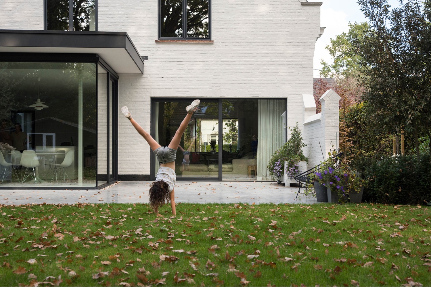 Een nieuw gelijkvloers volume werd toegevoegd achter de bestaande woning. Dit volume, dat de zithoek bevat, werd verschoven t.o.v. het bestaande hoofdgebouw. Hierdoor ontstaat aan de zijde van de tuin een overdekt terras en rechts van de woning een ingesloten terras / patio aansluitend op de nieuwe keuken en waar van de avondzon kan genoten worden. Eetplaats, een bureau en hobbyruimte voor de kinderen werden ingericht op het gelijkvloers in het bestaande deel van de woning. Op de verdieping werden de kinderkamers en kinderbadkamer gerenoveerd.