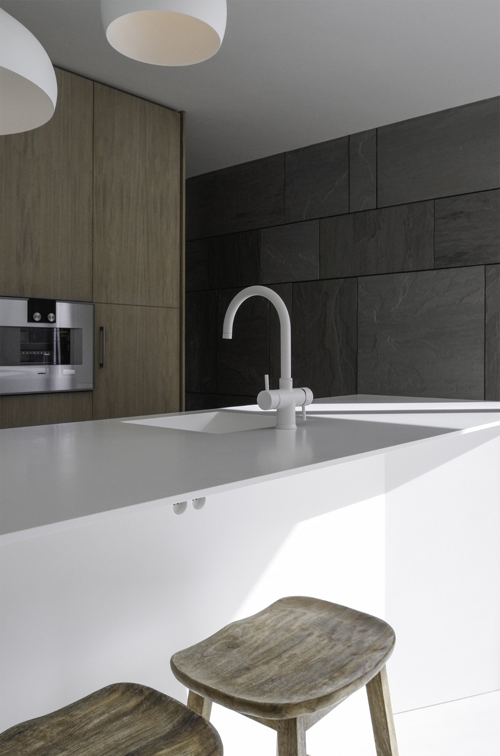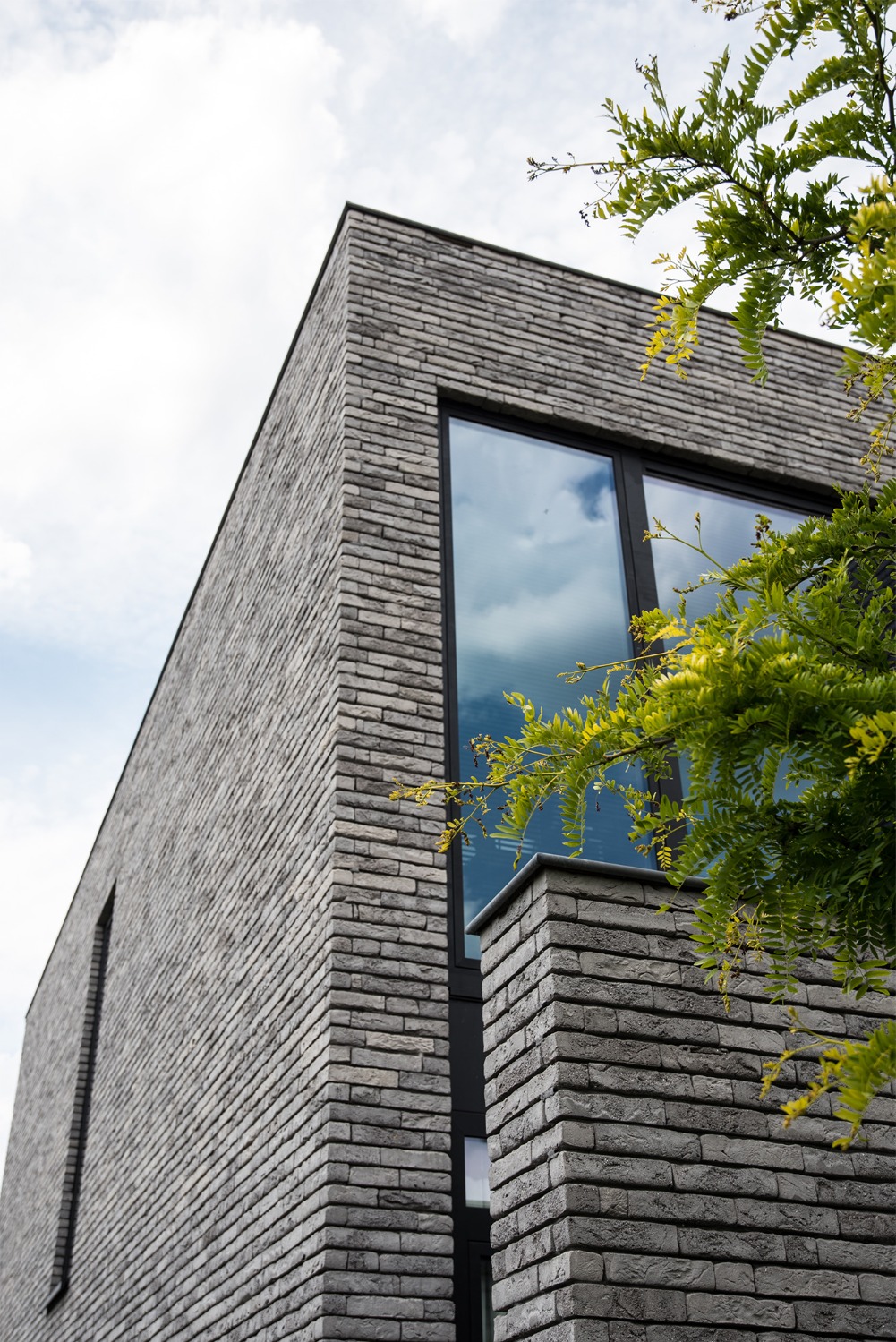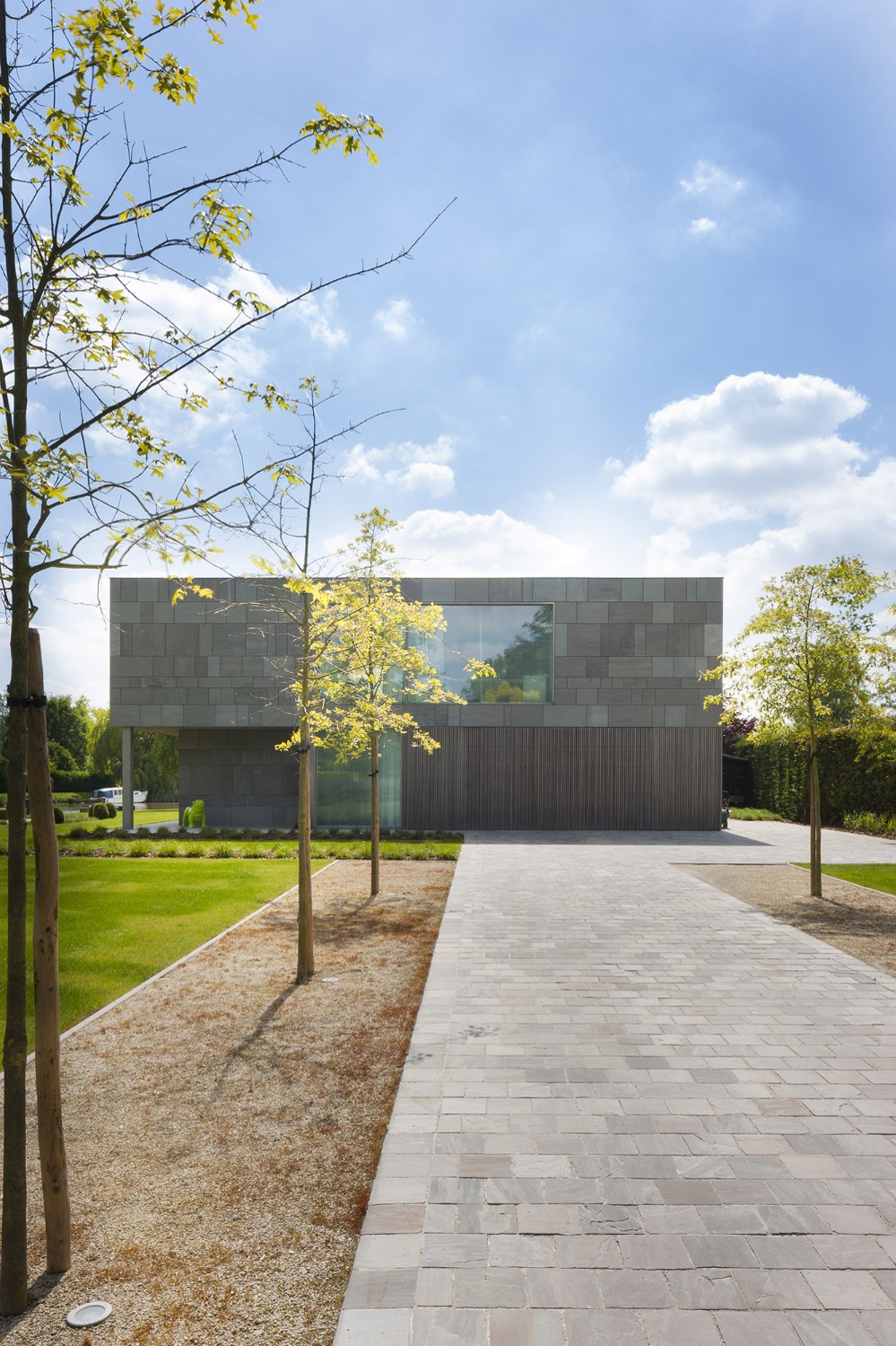 De woning werd zo ver mogelijk achteraan op het perceel ingeplant om maximaal te kunnen genieten van de ligging langsheen de Leie. De leefruimtes op de verdieping, aansluitend op een ruim overdekt terras bieden een panoramisch zicht op deze idyllische bocht aan de Leie. Zithoek en eetplaats met open keuken werden t.o.v. elkaar verschoven zodat plaats ontstond voor het overdekte terras en de verschillende leefruimtes afgebakend werden zonder ze visueel van elkaar te scheiden. Het typische nacht- en dag gedeelte ontbreekt in deze woning. Op de verdieping werd naast de leefruimtes een bureauruimte en slaapkamer met eigen badkamer voorzien. De master slaapkamer met dressing en badkamer vormen een eigen geheel op het gelijkvloers. Aansluitend op het gelijkvloerse terras met zwembad werd een welnessruimte met sauna en stoomcabine ontworpen. Ruwe platen leisteen verlenen de gevels hun levendig karakter.
