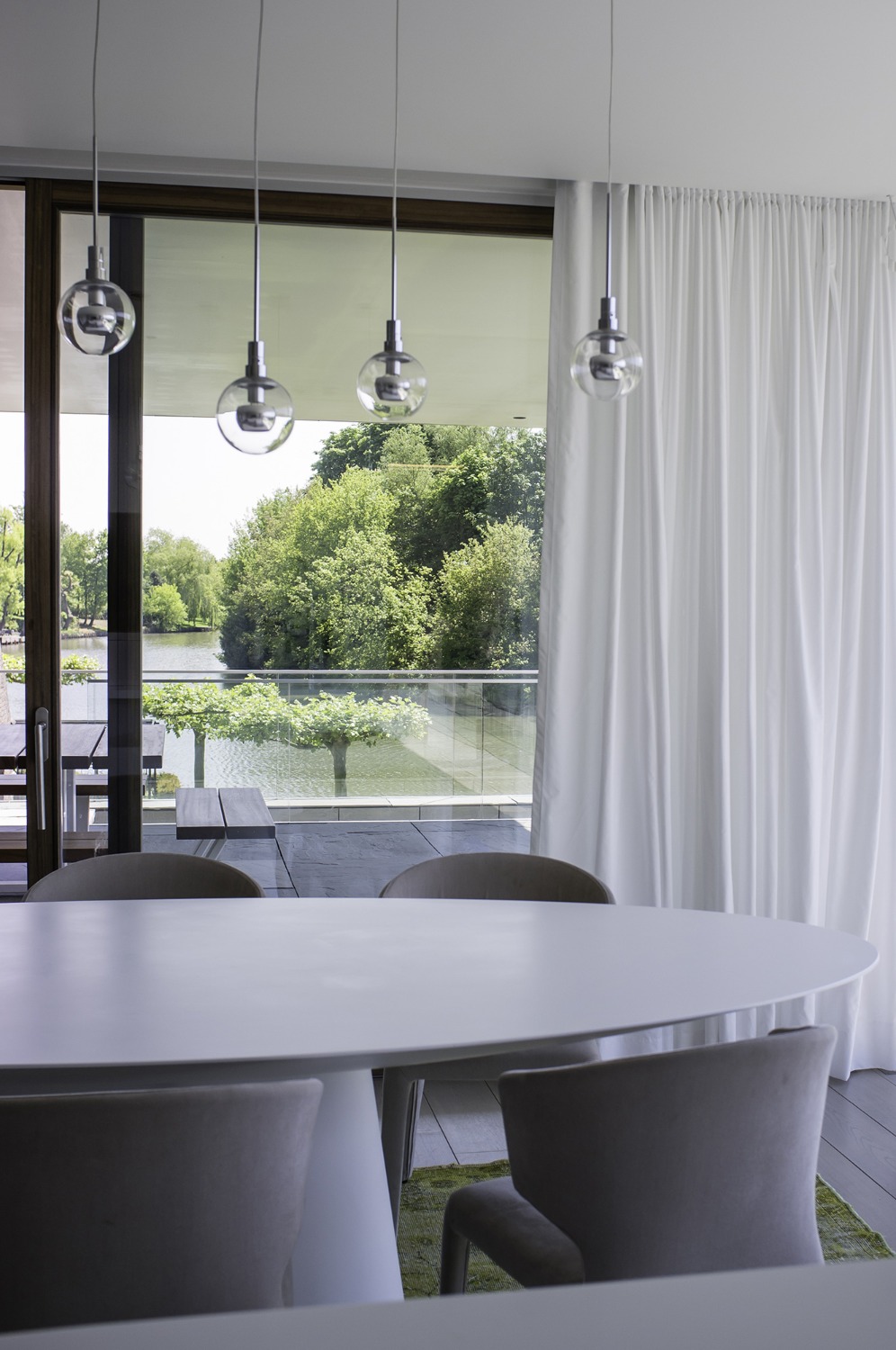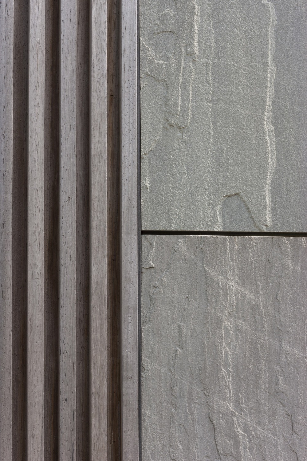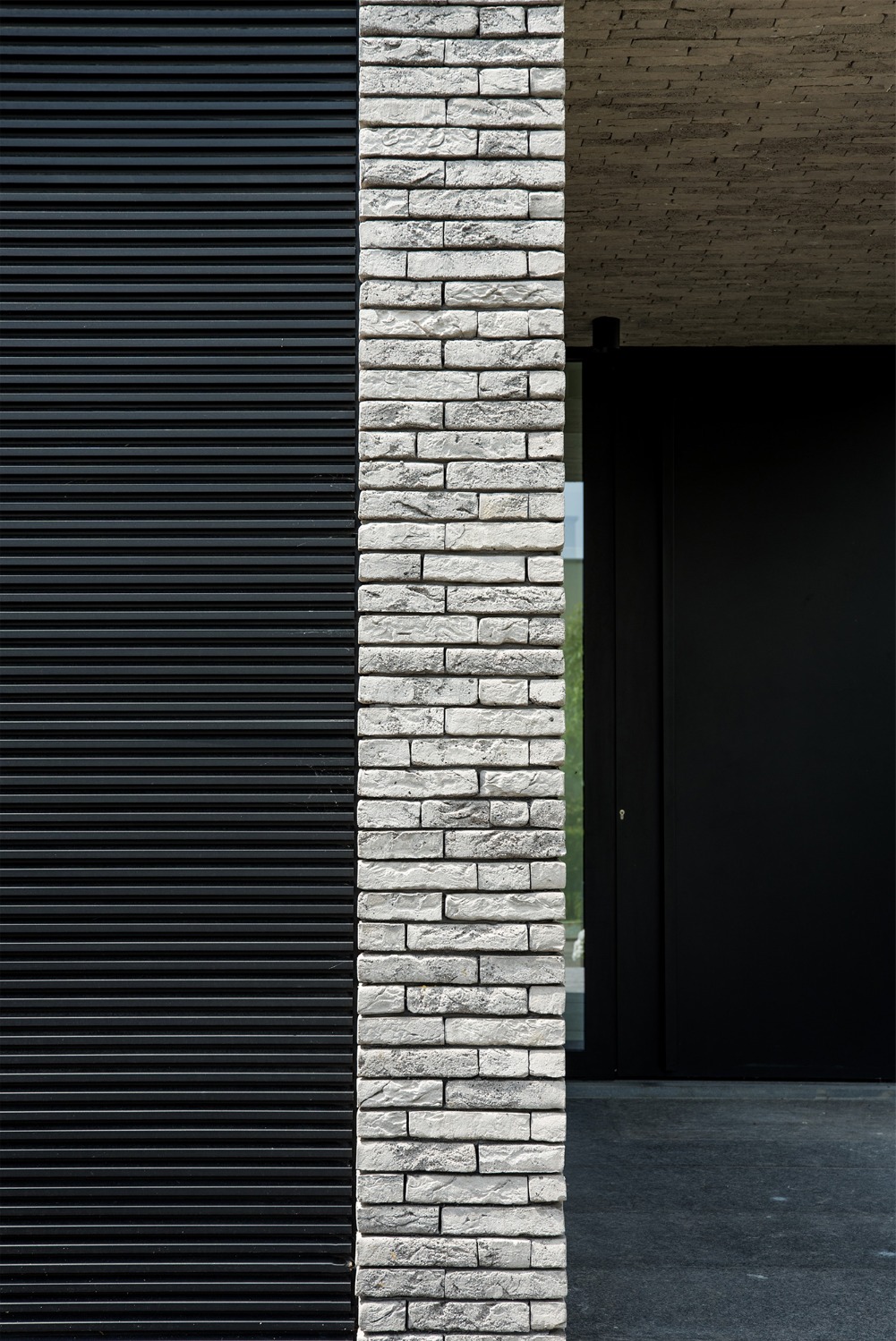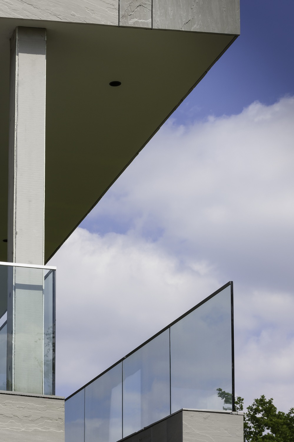 De woning werd zo ver mogelijk achteraan op het perceel ingeplant om maximaal te kunnen genieten van de ligging langsheen de Leie. De leefruimtes op de verdieping, aansluitend op een ruim overdekt terras bieden een panoramisch zicht op deze idyllische bocht aan de Leie. Zithoek en eetplaats met open keuken werden t.o.v. elkaar verschoven zodat plaats ontstond voor het overdekte terras en de verschillende leefruimtes afgebakend werden zonder ze visueel van elkaar te scheiden. Het typische nacht- en dag gedeelte ontbreekt in deze woning. Op de verdieping werd naast de leefruimtes een bureauruimte en slaapkamer met eigen badkamer voorzien. De master slaapkamer met dressing en badkamer vormen een eigen geheel op het gelijkvloers. Aansluitend op het gelijkvloerse terras met zwembad werd een welnessruimte met sauna en stoomcabine ontworpen. Ruwe platen leisteen verlenen de gevels hun levendig karakter.