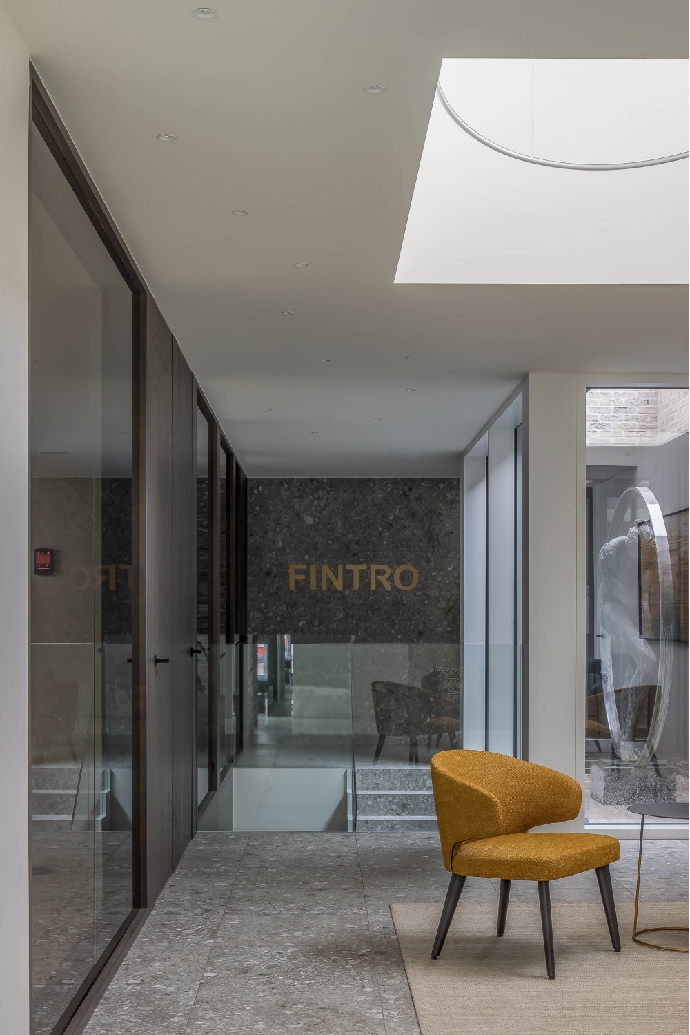 Het bestaande bank- en verzekeringskantoor diende uitgebreid te worden met een deel nieuwe burelen, een extra vergaderzaal en de nodige archiefruimte. De organisatie van het kantoor en de loketten werd volledig herbekeken. Zo kwam het eerste open Fintro bankconcept tot stand. Klanten worden momenteel ontvangen in een open foyer waar de meeste verrichtingen kunnen gebeuren. Een wachtruimte en de nodige individuele burelen werden gegroepeerd rond een patio die centraal licht binnenlaat. De vergaderzaal en archiefruimtes werden voorzien in de nieuwe kelderverdieping. Daglicht kan via de patio en naastgelegen trap doordringen tot in deze ondergrondse ruimtes.