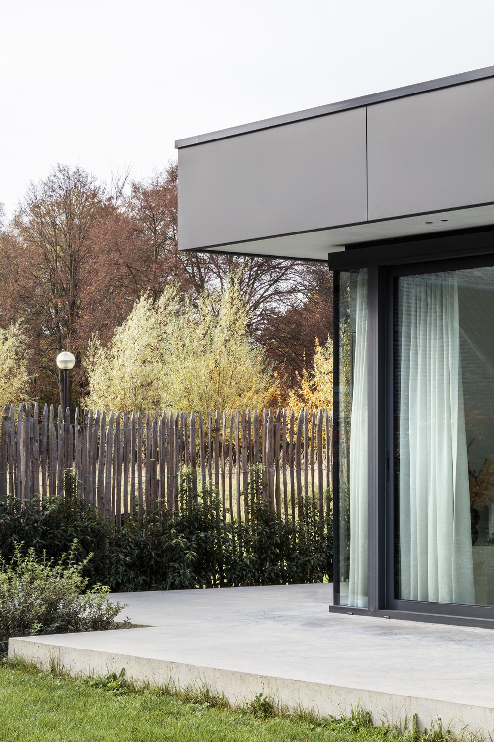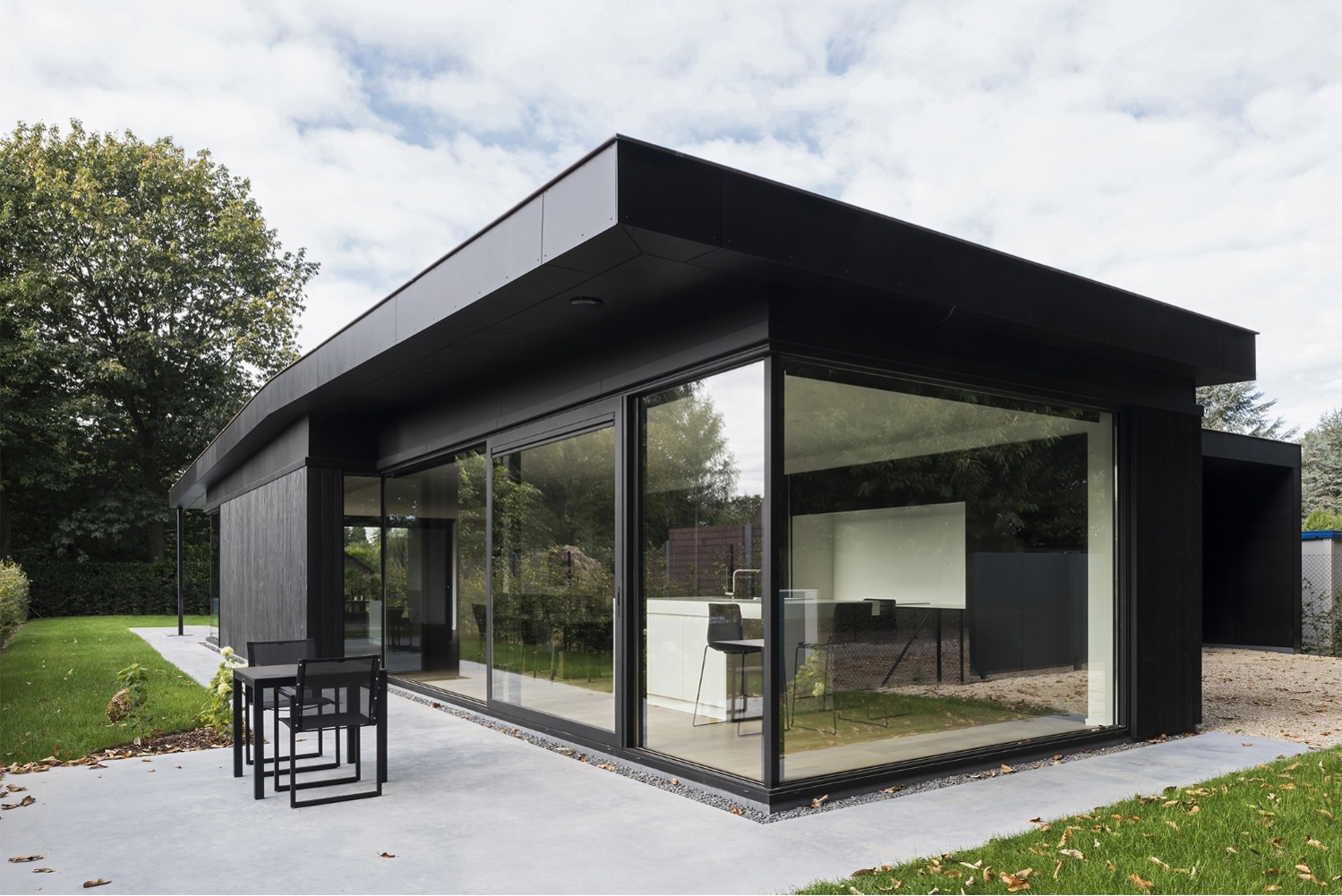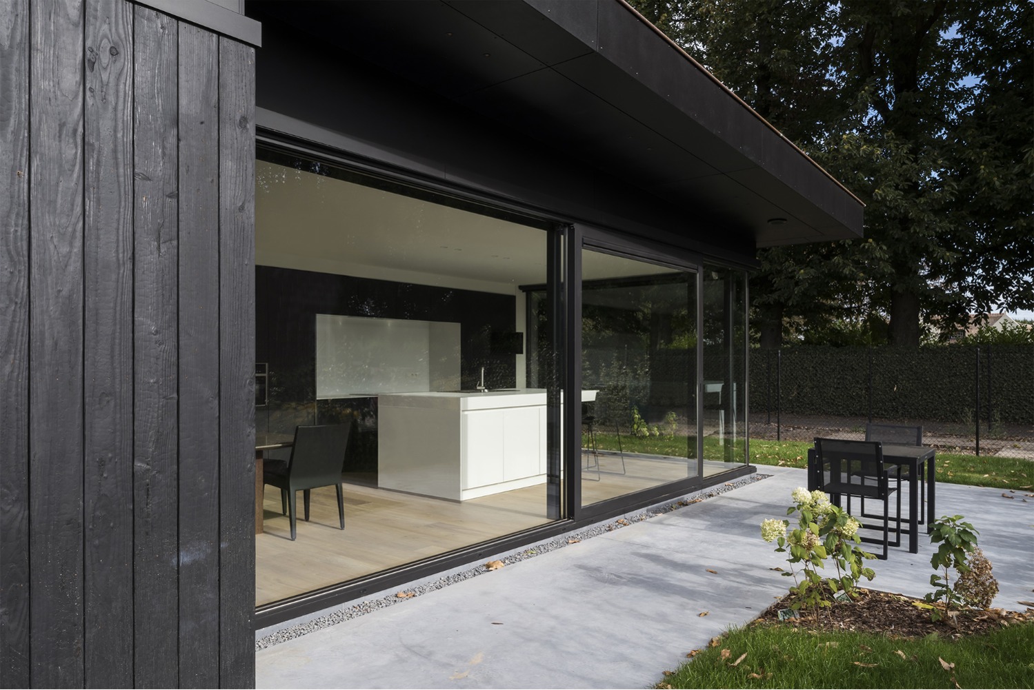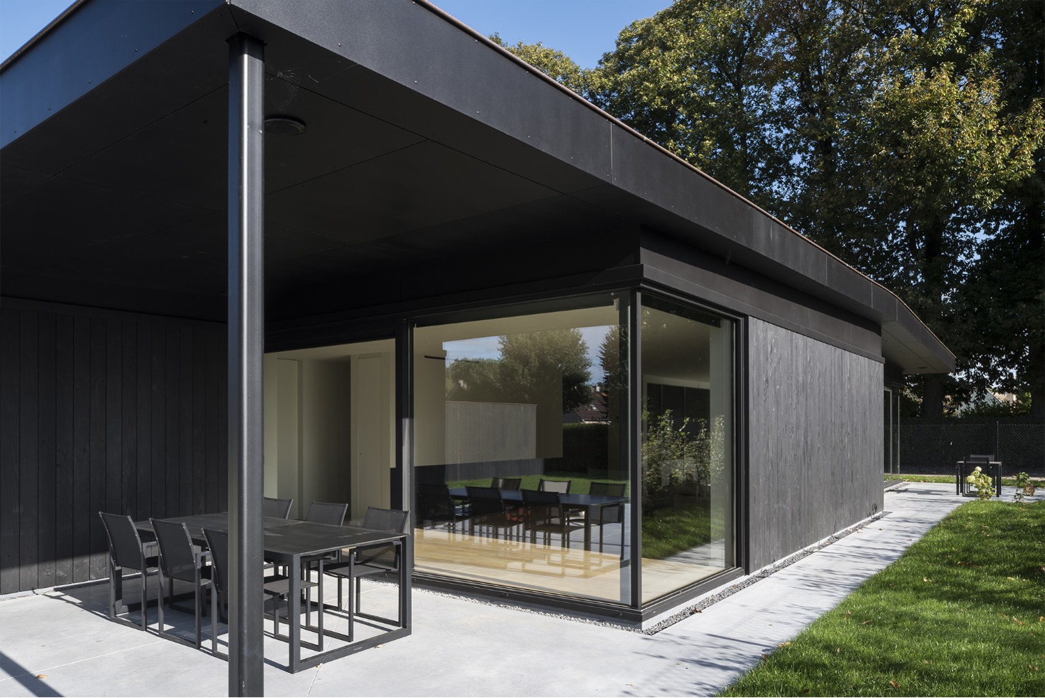 De opdrachtgever wenste een woning voor een zeer strikt budget. Om deze reden werden alle ruimtes gelijkvloers ontworpen. De leefruimtes liggen in elkaars verlengde aan de zuid-oost zijde van het perceel. Op deze wijze geniet de woning zowel van de tuin achteraan als van de prachtige rij kastanjelaars aan de voorzijde. De licht hellende dakvlakken verlenen de woning haar karakteristieke silhouet. Door middel van grote oversteken werden achteraan een overdekt terras en zijdeling van de woning een carport gecreëerd. De gevels werden afgewerkt met zwart gebrand hout gekend als ‘Shou Sugi Ban’, een klassieke japanse houtbeschermingstechniek.