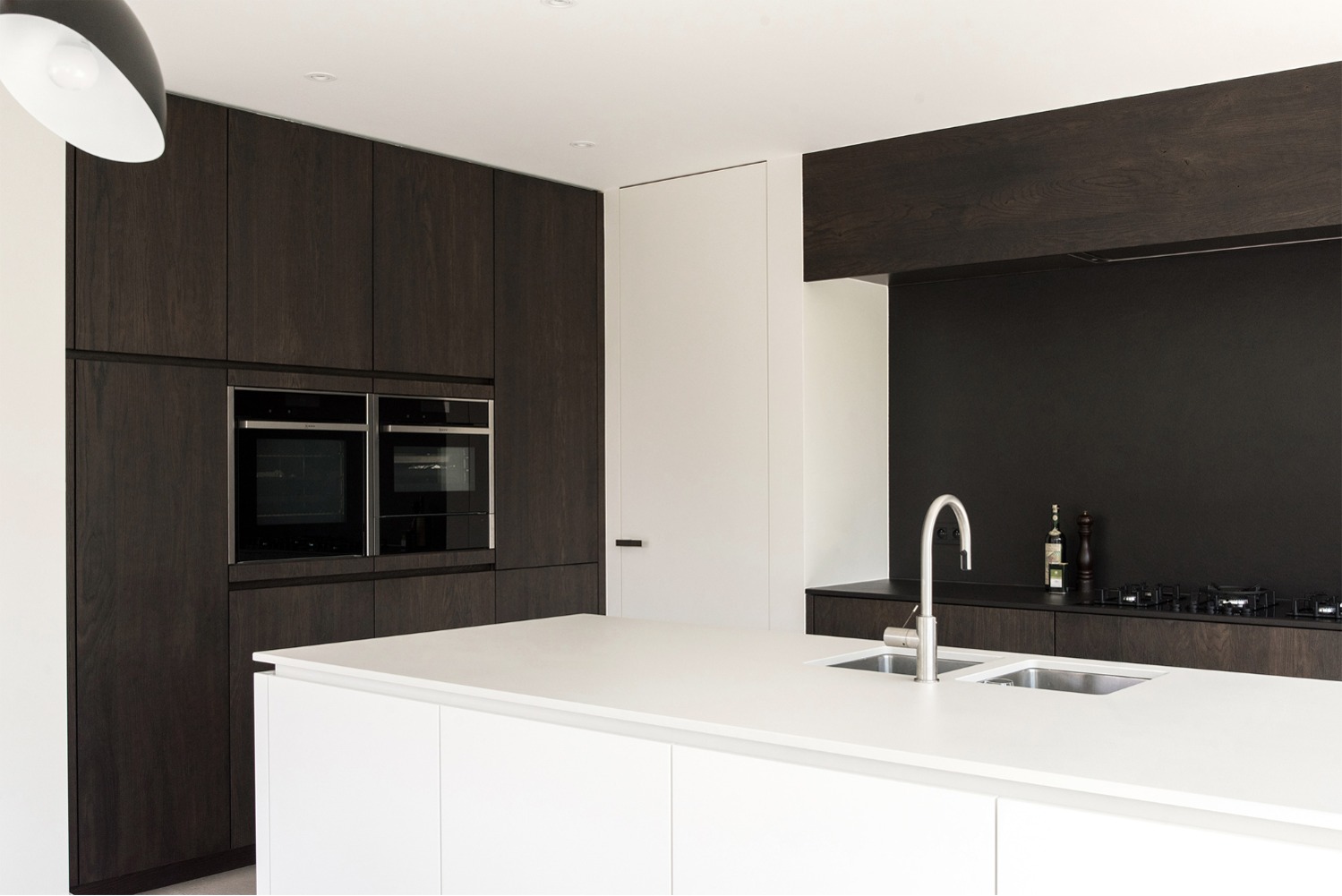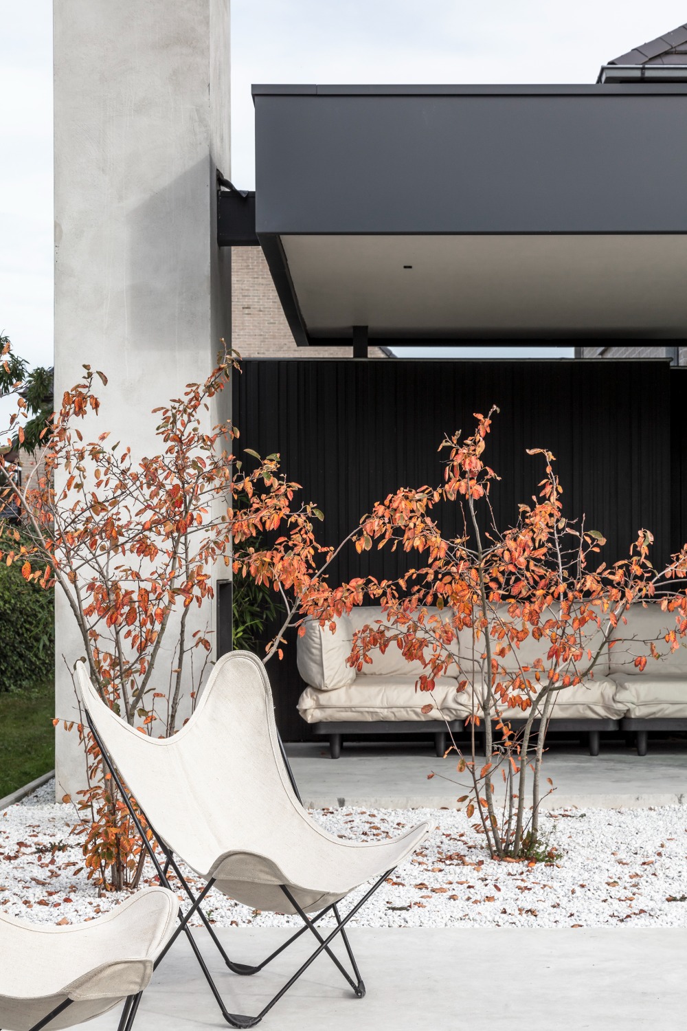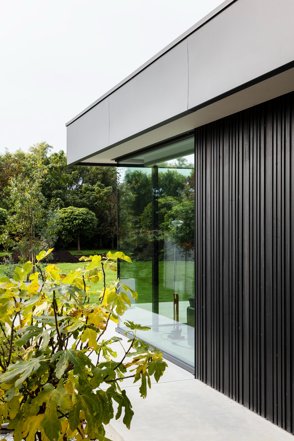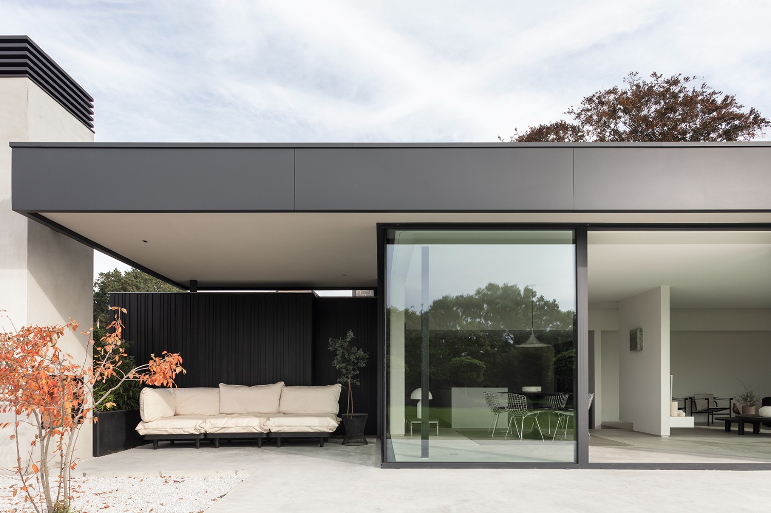 De opdrachtgever wenste een woning voor een zeer strikt budget. Om deze reden werden alle ruimtes gelijkvloers ontworpen. De leefruimtes liggen in elkaars verlengde aan de zuid-oost zijde van het perceel. Op deze wijze geniet de woning zowel van de tuin achteraan als van de prachtige rij kastanjelaars aan de voorzijde. De licht hellende dakvlakken verlenen de woning haar karakteristieke silhouet. Door middel van grote oversteken werden achteraan een overdekt terras en zijdeling van de woning een carport gecreëerd. De gevels werden afgewerkt met zwart gebrand hout gekend als ‘Shou Sugi Ban’, een klassieke japanse houtbeschermingstechniek.